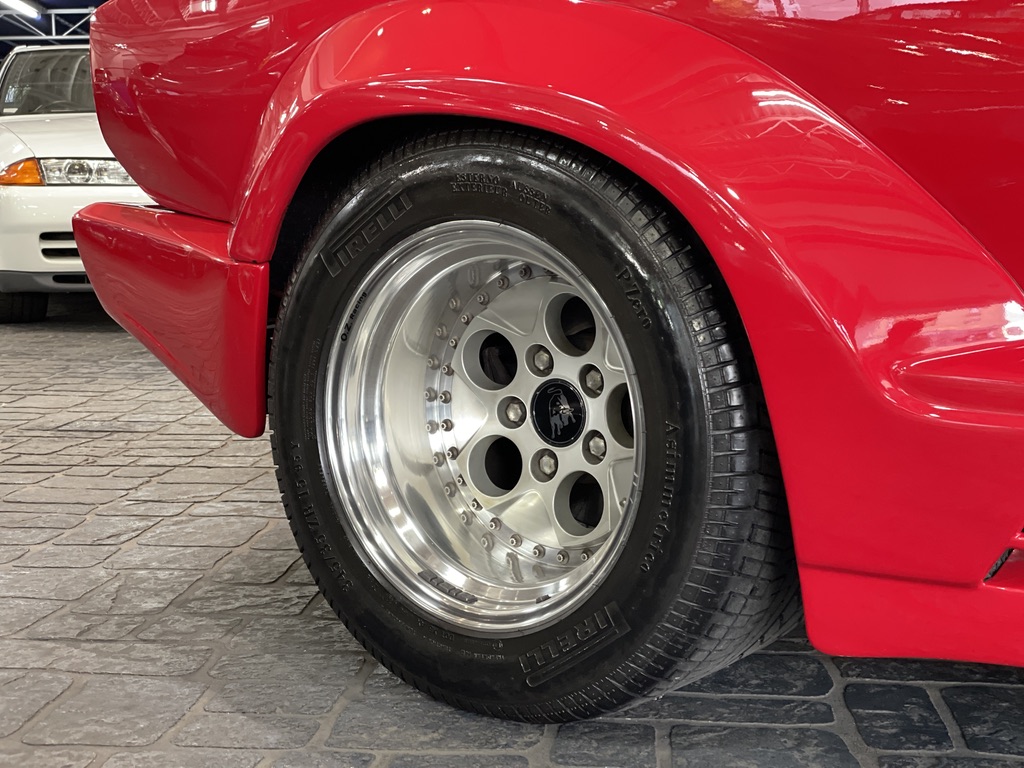 「カウンタック・アニバーサリー」のデビューは1988年9月8日、新たにランボルギーニ社の経営権を手に入れたクライスラー社社長リー・アイアコッカ、並びにランボルギーニ創業者フェルッチオ・ランボルギーニ参列のもと挙行された「ランボルギーニ社創立25周年記念式典」のイタリアはパルマに近い会場であった。ショー・デビューは同じ月のパリ・サロンとなる。パワートレインは、それまで製造されていた「5000クワトロバルボーレ」を踏襲しながら、リニューアルされたエクステリア、及びインテリアを持つ。フロントエアダム、サイドスカート、前後バンパー、アグレッシブなボディショルダー部のエアスクープなどが専用デザインをもつ「カウンタック」の最終進化モデルとなる。「カウンタック」のデザインはカロッツェリア・ベルトーネに在籍したマルチェロ・ガンディーニによるものとなるが「カウンタック・アニバーサリー」の専用エクステリアのデザインは、オラチオ・パガーニによるもの。1955年アルゼンチンに生まれたパガーニは、カーデザイナーを目指し大学でデザインとエンジニアリングを学んだ。その後、5回のF1チャンピオンの経歴をもつ、同郷のファン・マヌエル・ファンジオをたより1982年ランボルギーニ社に入る。「LM002」「カウンタック・アニバーサリー」開発に携り、複合素材の知識に明るくカーボンファイバー素材の市販車への導入を図り、チューブラーフレームでは無くカーボンフレームをもつ「カウンタック・エボルツィオーネ」を製作するまでになった。その技術は「カウンタック・アニバーサリー」にも活かされ、ボディシェルの一部に複合素材が使用される初の市販車とされた。1992年オラチオ・パガーニは独立し1999年には「パガーニ・ゾンタ」を発表する。「カウンタック」登場時の「LP400」の設計はパオロ・スタンツァーニによるもので、1968年「ミウラ」のグレードが「S」から「SV」に進化するタイミングで始まっていた。シャーシ開発のジャンパオロ・ダラーラの「試作車を販売してしまった」という発言どおり「ミウラ」での熟成度と信頼性を確立出来なかったという反省から「カウンタック」の開発に時間をかけたかったのだろう。プロトタイプとなる「LP500」は鋼板モノコック構造となっていたが、強度と重さの関係から、市販車となる「LP400」では作り慣れたチューブラーフレーム構造に変更された。そのフレームはマルケジーニ社に、外皮となるアルミパネルはトリノのITCA社に発注された。出来上がったチューブラーフレームは、直径40mmの円断面鋼管によるトラス構造を基本に、ため息が出る程複雑精緻に組み上げたもので、工芸品ともよべる贅沢でオーバークオリティなものとなっている。それにも増して鮮やかなのは、パワートレインレイアウト。「ミウラ」のV12エンジン横置きレイアウトは、リアヘビーとスペースの関係からサスペンションアーム設計の自由度に欠けた事により「カウンタック」では縦置きとされた。しかも、通常の縦置きとは前後逆に配置し、ボディ前方に向かってクラッチ、トランスミッションと並べてある。前方にアウトプットされた出力は、エンジン直下のウェットサンプのオイルパンの中をドライブシャフトが貫通し、リアデフに伝達されるという斬新なレイアウトとなる。スタンツァーニはこの設計でV12エンジン縦置きと、短いホイールベース内にパワートレインを納めるという事を両立してみせた。「カウンタック・アニバーサリー」にもこのチューブラーフレームとパワートレインレイアウトが継承されている。エンジンは「フェラーリ250GTO」の開発で名を馳せたジオット・ビッザリーニ設計によるものを基本としたもの。V12エンジンとしては極めてコンパクトな外寸をもち、ひたすらパワー志向で仕立てられ、原初設計3.5ℓで「ミウラ」搭載時に、ビッザリーニの後を引き継いだジャンパオロ・ダラーラにより4ℓ化され「カウンタックLP400」にも搭載された。4ℓ化された時点で基本設計からの伸びしろを使い果たしたこのエンジンを、マセラティからランボルギーニの技術チーフに就任したジュリオ・アルフィエーリが救う事になる。ジュリオ・アルフィエーリは1961年にフェラーリからジャンパオロ・ダラーラを引き抜きマセラティで育てた人物。ダラーラは、その後ランボルギーニに移籍し「ミウラ」で脚光を浴びるが、アルフィエーリはその裏で「マセラティ・ボーラ」を地道に開発していた。そのアルフィエーリが、ランボルギーニの伸び代を使い果たしたエンジンのブロックとシリンダーヘッドの間にアルミスペーサーを挿入し、ストローク延長の余裕を与えた。これにより「カウンタック・アニバーサリー」に搭載される5.2ℓまで拡大されるのに留まらず、次期モデル「ディアブロ」にも5.7ℓ化されて搭載されることとなった。「カウンタック・アニバーサリー」に搭載されるエンジンは60°V12気筒DOHC48バルブとなり