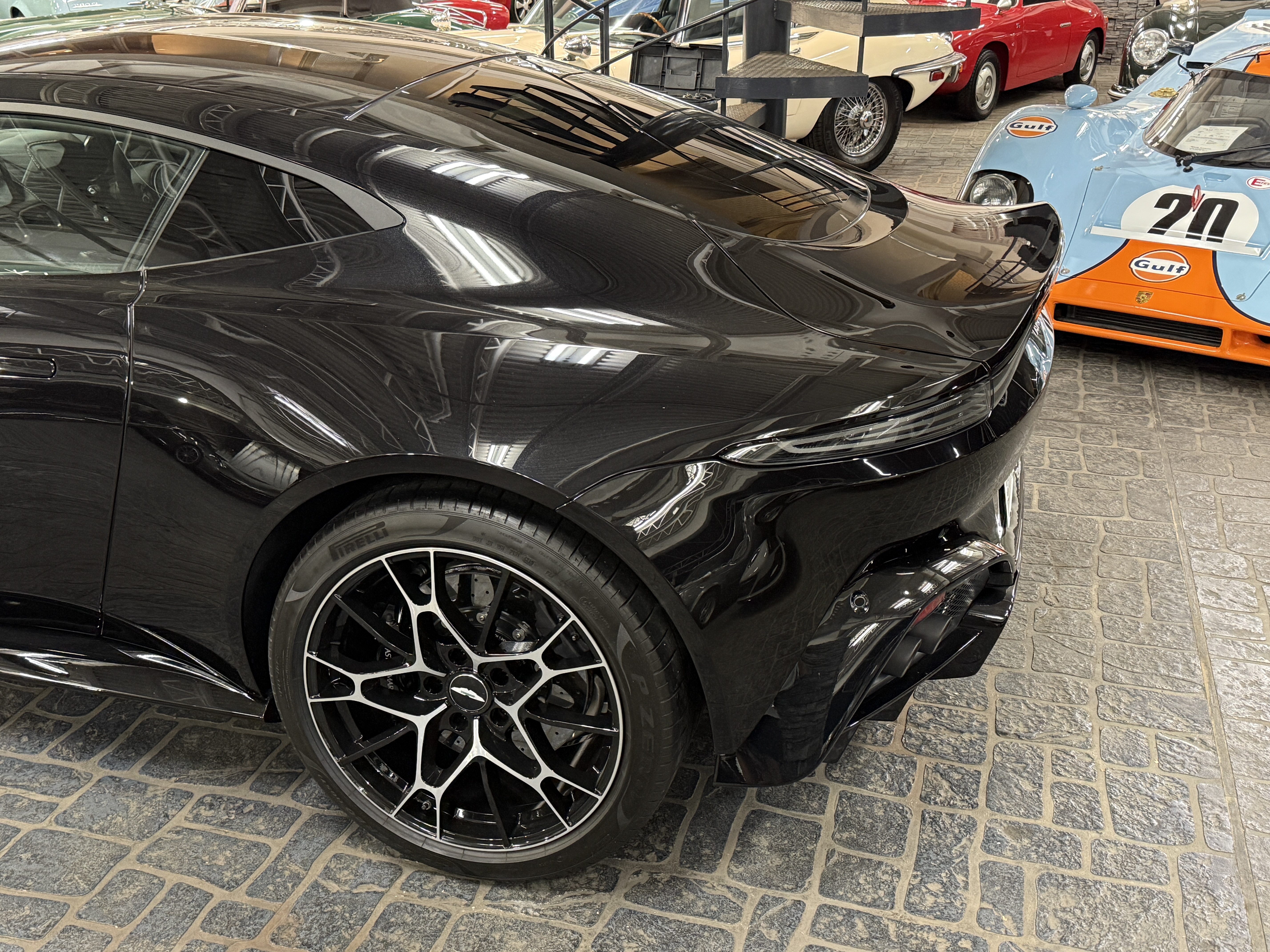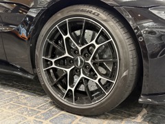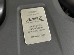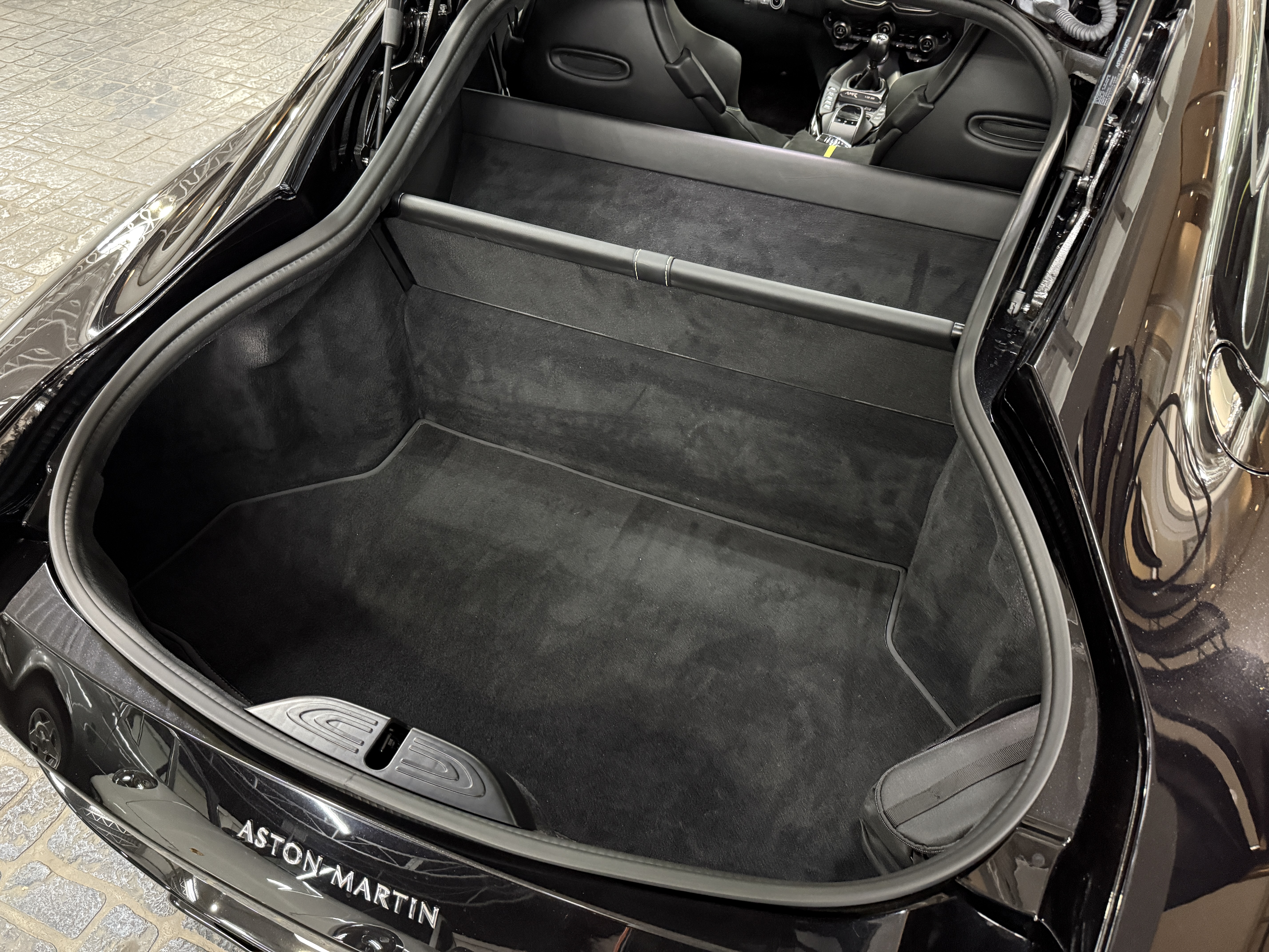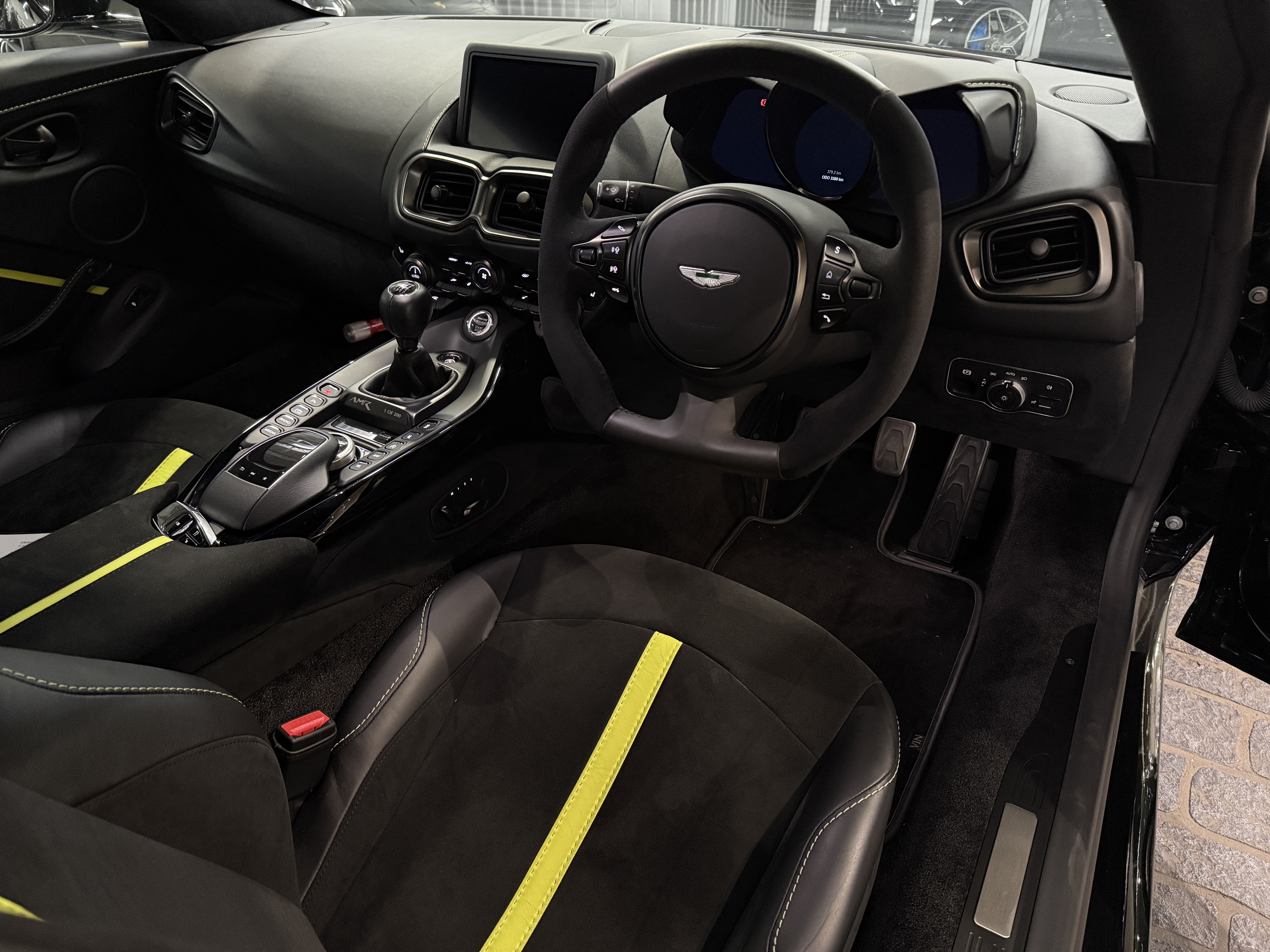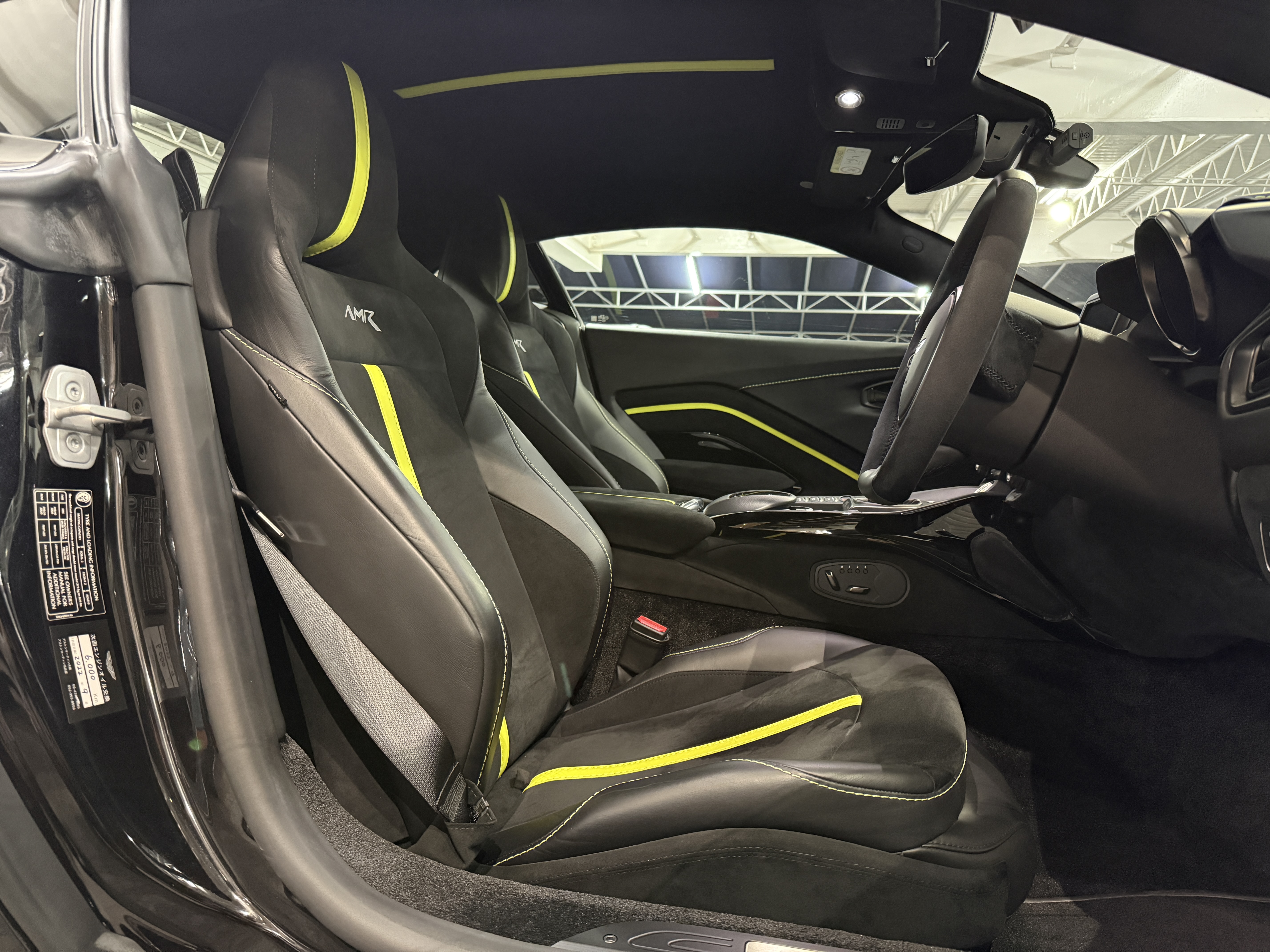 ⚪︎今回入荷した車両は「ヴァンテージ」のキャラクターと個性に更に磨きをかけ、2019年5月に発表された「ヴァンテージAMR」となる。限定200台というカタチで販売されたこのモデルは59台の「ヴァンテージAMR59エディション」と、141台の「ヴァンテージAMRヒーローエディション」に分けられ生産された。「59エディション」は、1959年に「ル・マン24時間耐久レース」に於いて1-2フィニッシュを達成した「DBR1」の60周年を記念し、スターリンググリーンとライムカラーでエクステリアを仕上げられたモデルとなる。そして「ヒーローエディション」は、5色のエクステリアカラーが設定され、好みのカラーが選択出来るモデルとなっている。販売とほぼ同時に即完売となった、特別なエクステリア/インテリアをもつ限定モデル200台の後「ヴァンテージAMR」として2020年にはカタログモデルとして生産が継続された。限定モデル/量産モデルともに「ヴァンテージAMR」は共通のメカニズムをもつ。「AMR」モデルであるだけに95kgの軽量化が図られるとともに、その最大の要因ともいえる軽量7速マニュアルトランスミッションを装備する事を特徴とし、カーボンパーツが多用されるとともにカーボンセラミックブレーキ・システムが組み込まれ、理想的な前後重量配分50:50を実現している。ベース・モデルの特徴ともなっていた電子制御式リアデフは、シンプルな機械式LSDとされた事により、更にダイレクトな走行感覚と強い一体感が得られる方向にチューニングが施されている。その入念なチューニングは車両特性部門のチーフ・エンジニアであるマット・ベッカーを中心に進められた。︎「ヴァンテージAMRヒーローエディション」に搭載されるエンジンは、水冷90°V型8気筒DOHC直噴ツインターボとなりボア×ストローク83mm×92mmから3982ccの排気量を得る。90°のバンク角で配置されたシリンダーの谷間に、2つのターボチャージャーをレイアウトする「ホットインサイドV」方式を採用し、コンパクトでありながらターボへの吸気経路を最適化することで優れたレスポンスを実現。AMG製車両にはドライサンプ方式が採用されるこのエンジンは「ヴァンテージ」に搭載するにあたりウェットサンプ化され、そのサウンドも含めアストンマーティンによりチューニングされたものとなっている。エンジンの最終仕上げはアストンマーティンで行われ、担当したメカニックのネームプレートがエンジンに付けられる。10.5の圧縮比をもち、最高出力510馬力/6000rpm、最大トルク63.7kgm/2000〜5000rpm(最高出力は、8速ATのベースモデルと同じ数値となるが、最大トルク値は68.8kgmを発生するベースモデルに比べ、デチューンされている。これは軽量設計のギア・ボックス保護の意味も含まれる)を発揮する。そしてこのエンジンの最高許容回転数は、ベースモデルが6300rpm迄なのに対して、7000rpmに引き上げられている。組み合わされるトランスミッションは、イタリアのグラツィアーノ社製7速マニュアルトランスミッションとなり、トランスアクスル方式でリアに搭載される。またベースモデルでは電子制御式リアデフが採用されるが、この「AMR」モデルでは加速側38%、減速側40%のロック率を持つ、オーソドックスな機械式のLSDが装備され、よりダイレクトな走行感覚が得られる様にチューニングが施されている。