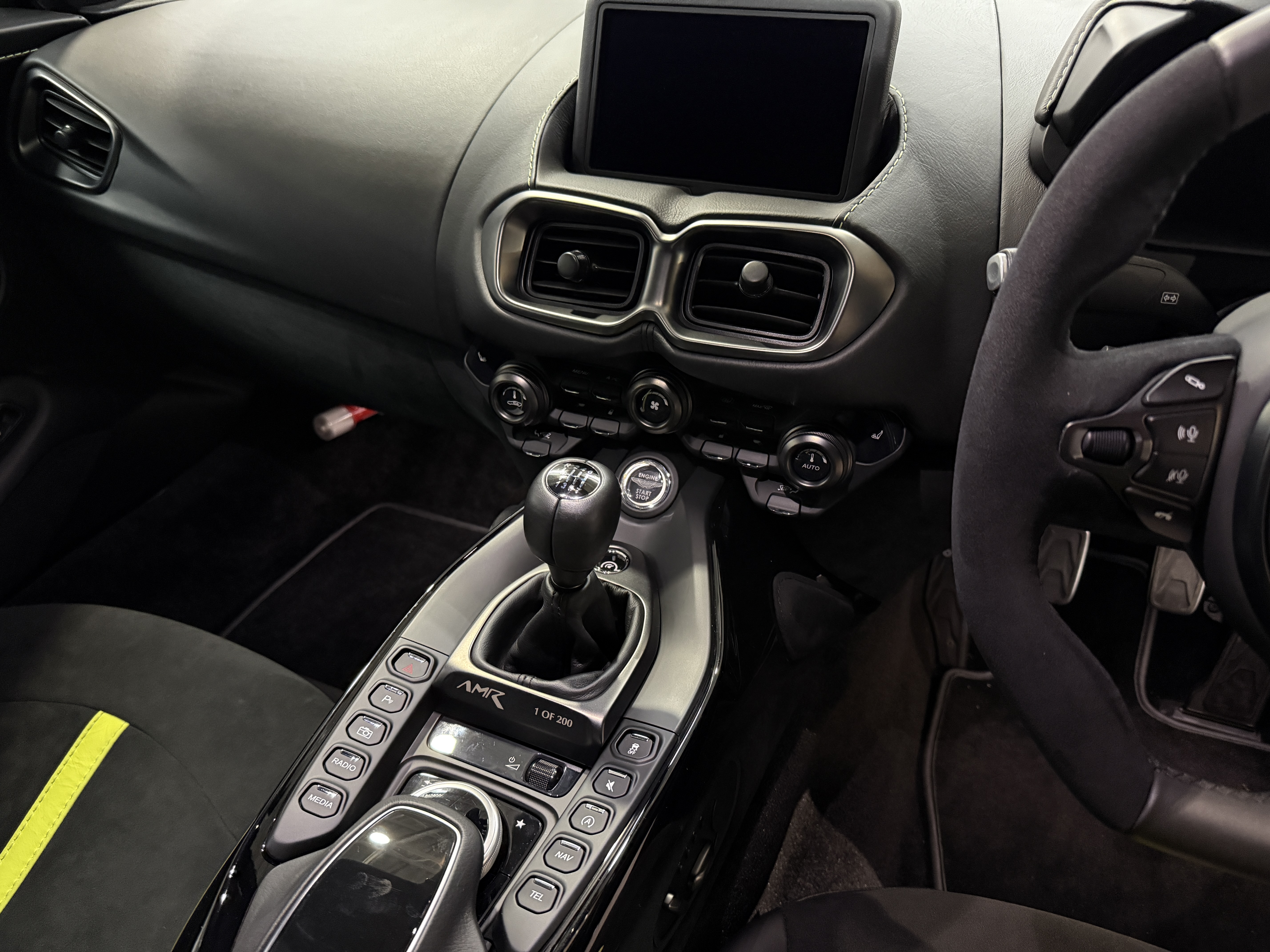 ︎足回りはフロント・ダブルウィッシュボーン式+コイルスプリング、リア・マルチリンク式+コイルスプリングとなる。電子制御式ショックアブソーバーが採用され、3つのモードからダンピング特性が選択可能となる。ブレーキはフロント410mm径、リア360mm径のベンチレーテッド・カーボンセラミック・ディスクが装備され、それぞれ6ポッド、4ポッドのアルミキャリパーと組み合わされる。200台限定の「AMR」モデルには、前後ともに20インチの専用デザインとなる、軽量鍛造ホイールが装備され、フロント・255/40ZR20、リア・295/35ZR20サイズのタイヤが組み合わされている。︎複数の素材による黒をベースとするインテリアには、鮮やかなライムグリーンのアクセントが用いられることで「AMR」モデルらしさが表現されている。ダッシュボードはアルカンターラ張りとされ、専用のバックスキンとレザーのコンビによるステアリングを通して、正面には8インチ液晶スクリーンを配置する3眼式とされるのはベースモデルと同様となる。センターコンソールのデザインはMTシフトレバーが置かれる事で、ATモデルとはイメージが異なる。MTのシフトパターンは左手前に1速がレイアウトされるレーシングパターンとされ、それを英国流では“ドッグレッグ”パターンとよぶ。2〜6速で形成されるダブルHパターンから、1速だけが左側手前にクランクして飛び出している形状を、犬の曲がった後ろ足に例えた表現とされている。MTは、それなりのストローク量を必要とするが、確実なフィールによるシフトチェンジが可能となる。また、この7速MTには「AM SIFT」とよばれる機能が採用されている。クラッチ、シフトポジション、カーボン製プロペラシャフトのセンサーにより、シフトアップ・ダウン時に自動的にエンジン回転数を合わせることでスムーズなチェンジを可能とするシステムで、ドライバーが選択可能なシステムとなっている。シフトノブの奥にはエンジンのスタート&ストップ・ボタンが配置され、手前にはアイドリング・ストップを含む、インフォテイメントシステム等を司るスイッチ類が整然とレイアウトされる。電動調整式となるハイバックタイプのシートは、アルカンターラとレザーで仕立てられ、そのシートバックやセンターコンソール上、スカッフプレート上には「AMR」のロゴが配置されている。ドライブモードは「スポーツ」「スポーツ+」「トラック(サーキット)」と、3つのモードが用意され、それぞれのモードに於いてエンジン・レスポンス、足回り、ステアリングの重さが調整されている。シート背後には小物が置ける棚があり、ハッチを備えるラゲッジスペースの容量は350ℓとなっている。︎全長×全幅×全高は4465mm×1942mm×1274mm、ホイールベースは2704mm、トレッドは前後ともに1605mm、車両重量は1499kgとなっている。「ヴァンテージAMRヒーローエディション」の新車時価格は2504万5370円(8ATのベースモデルの価格は2138万4000円)で、燃料タンク容量は74ℓとなる。メーカー公表性能値は、0→100km/h加速4.0秒、最高速度314km/hとなっている(8ATのベースモデルはそれぞれ3.6秒と314km/hとなる)。今回入荷した「ヴァンテージAMRヒーローエディション」は、オニキス・ブラックのボディを持つ為、カーボン製エアロ・パーツがボディ・カラーとの一体感を見せ、コンパクトながらも迫力あるボディの抑揚がクローズアップされている。アストンマーティンらしく、やや上方に開くスワン・スウィング・ドアを開いてみると、センターコンソールからMTシフトレバーが突き出て見える光景に、違和感を覚えるかもしれない。旧世代のスポーツ・モデルでは当たり前だったこの光景は、ATが主流となる近年のスポーツモデルでは見かけなくなり、セレクターレバーさえ存在せず、ボタンやパドルにとって代わることでフラットなセンターコンソール化が進んでいる。それでもエンジン・スタート・ボタンによりエンジンをかけて、クラッチ・ペダルを踏んで左手前に位置する1速にギア・レバーを引き込むところから始まる車両との一体感は、ただ単にクルマで移動するのとは明らかに異なる感覚を生み出す。操作の煩わしさより、ドライバー自身がクルマを走らせるという意味を明確化するツールとして、マニュアル・トランスミッションの存在感に改めて気付かされる。クラッチをエンゲージすると、容易くクルマは動き出してくれる。ハイパワーユニットであっても、低回転域のトルクは犠牲にされる事なく、しっかりと機能する。そしてシフトアップのタイミングでギア・レバーを2速へ送るが、電光石火のチェンジというワケにはいかない。ギアボックスはトランスアクスル方式でギア・レバーとは遠く離れて搭載されている。その関係から考えれば、しっかりとしたフィールと表現出来るギアボックスなので、慌てず確実に2速につないで、そこからはダブルHパターンに沿って、クラッチの断続と息を合わせてのシフトアップによりスピー