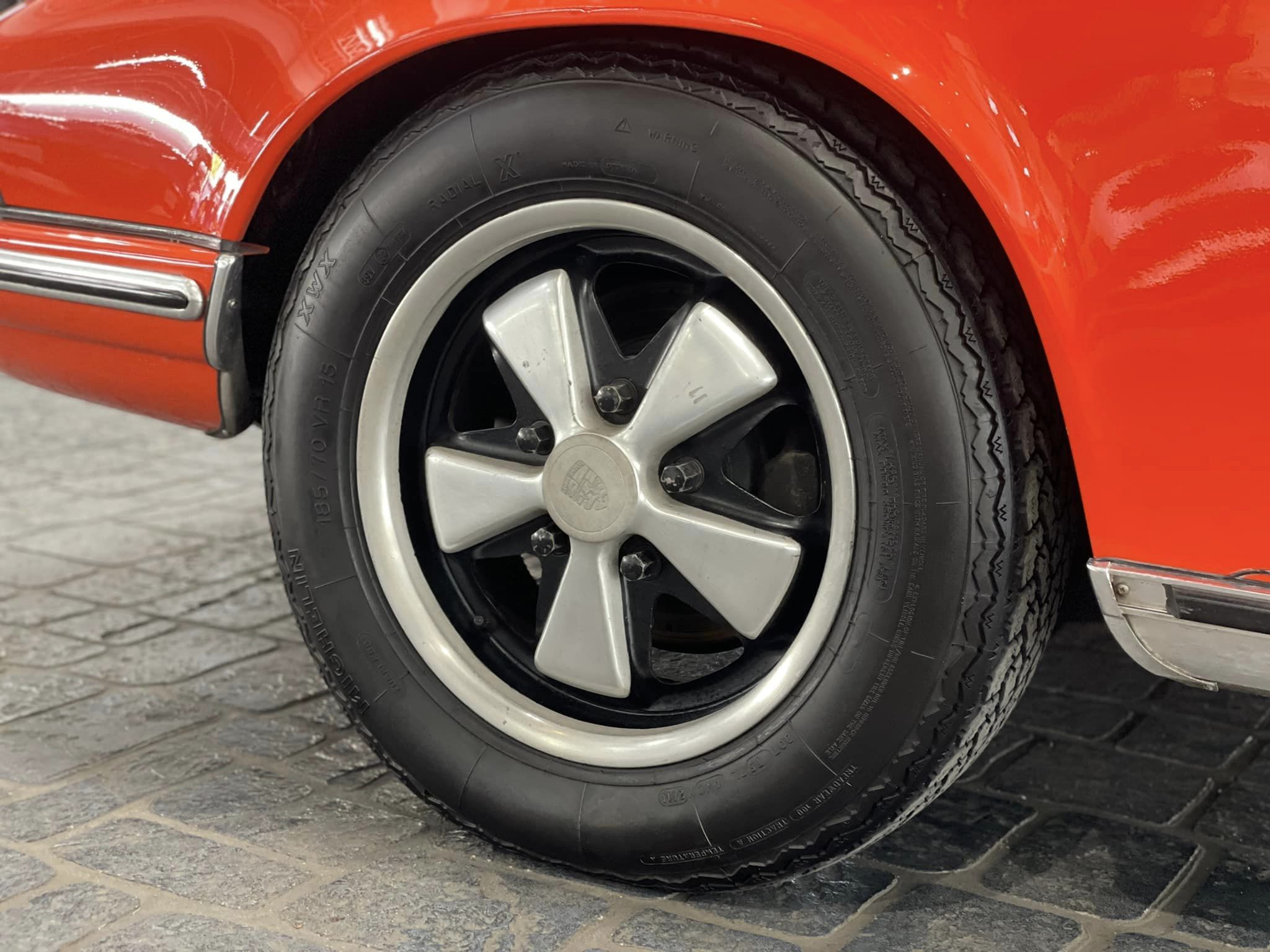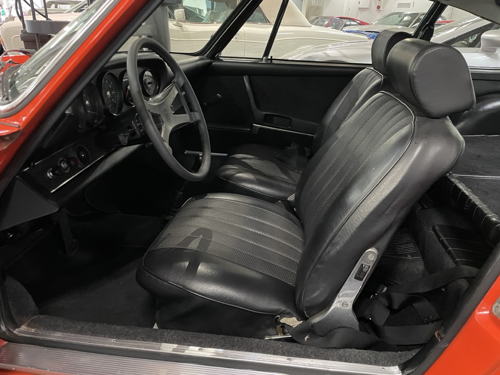 「ポルシェ911」の登場時は、情報だけが先行し1963年フランクフルトショーで「901」として発表されても、すぐに販売とはならなかった。エンジンやギアボックスを含むリアエンドの重さにより、ドライバビリティの確保とその対策に追われていたためといわれている。1964年3月のジュネーブショーでの展示を経て、8月に最終量産型の試作を始めると、プジョーから「車名の中央に0を持つ三桁の数字は登録済み」とクレームを受け、10月に「911」と改名するに至り、現在のポルシェの存在からは考えられない「ポルシェ911」の出発となった。日本での「ポルシェ911」のお披露目は1965年5月15日東京プリンスホテルで行われ、デビューしたばかりの新型4気筒モデル「912」を伴ってという形になった。初期型「911」は1967年式まで、大きな変更を受けずに生産され「0シリーズ」とよばれている。それ以前のモデルとなる「356SC」の影響を強く残した味わいをもち、2ℓ・130馬力エンジン搭載により130km/h以上での高速クルーズでも高いスタビリティを見せた。しかし、急なスロットルオフは直進安定性に影響を与え、タイトコーナーではオーバーステア傾向に注意が必要とされた。1968年からの「Aシリーズ」からは、高価となってしまった130馬力の標準モデル「911E」の廉価版となるグレートとして「911T」がラインナップされる。車名の「T」は「ツーリング」の頭文字とされコストダウンの為シリンダーヘッドはアルミとスチールによるバイラル構造では無く、鋳鉄製とされた。8.6という低めの圧縮比(標準型911Eは9.0)とおとなしいバルブタイミングにより、110馬力となったが、バルブ径とポート径は160馬力を発揮する「911S」と同サイズとなる大きなものを採用した。これは「911T」の簡素な軽量ボディをポルシェがレースのホモロゲに使用する事を目論んでいたからといわれている。また2ℓ時代のピーキーだといわれた「911」のラインナップの中では「911T」の比較的穏やかなエンジン特性は低速トルクも豊かで扱いやすく、日常使いにアドバンテージを持つ。1969年式から「Bシリーズ」となった「911」はロングホイールベース化と燃料噴射装置の導入という、大きな変更が施される事となった。フロアパンとエンジン/ギアボックスの搭載位置はそのままに、ハーフシャフトのジョイント容量を増やし後退角を付けサスペンションアームを延長して、ホイールベースを従来の2211mmから57 mm延長、オーバーステアなどシビアな操縦性を改善する為のものとなる。同時により太いタイヤを装着出来るように、前後フェンダーに僅かなフレアがつけられた。また、リアヘビーを是正する方向で、クランクケースがマグネシウム合金化され「911S」ではアルミ製エンジンフードが採用された。燃料噴射装置については「カレラ6」などレーシングカーからの経験により、ボッシュ製6プランジャー式メカニカル・インジェクションが用いられる。これはアメリカでのエミッションコントロール(70年にマスキー法が可決される)対策でもあった。「911T」だけはウェーバーキャブレターが装備され、標準モデルとなる「911E」と「911S」にはインジェクションが装備された。今回入荷した車両は1969年型「911T」となり空冷SOHC水平対向6気筒で、本来ボア・ストローク80.0mm×66.0mmで1991ccと8.6の圧縮比から110馬力/5800rpmと16.0kgm/4200rpmのトルクを発揮するエンジンと4速MTが搭載されている。このエンジンのボアを4mm拡大、84mmとしストロークはそのままとする事で2195ccとなり、ハイコンプピストン、2連装のトリプルチョークウェーバー、更にスポーツマフラー装着により2.2ℓの「911S」仕様にチューニング。それに伴い標準では4速となる変速機も「911S」同様に5速に換装されている。参考までに2.2ℓの「911S」のエンジンは180馬力/6500rpmと20.3kgm/5200rpmのトルクを発揮するといわれている。︎足回りは、フロント・マクファーソンストラット式+トーションバー、リア・トレーリングアーム式+トーションバーとなっている。ブレーキは前後ともにドリルド・ディスクが装備される。ホイールとタイヤサイズは、本来5.5J×15サイズに165HR15が組み合わされるところだが、エンジンのパワーアップに伴い2.2ℓ「911S」と同じく前後ともフックス製鍛造アロイ6J×15サイズに185/70VR15サイズのミシュランXWXを装備している。インテリアは現代まで続く「ポルシェ911」にも通じるメータークラスターを持ち、ステアリングを通して中央に大径のレブカウンターが配置される。ノーマル「911T」エンジンであればレブカウンターのレッドラインは6000rpmを超えたあたりに置かれるが「911S」仕様とされたエンジン特性にあわせて7000rpm手前(オリジナルの2.2ℓ・911Sは7200rpmから)にレッドゾーンが移されている。「911」伝統となるキーシリンダーはステアリングポストの左側に位置し、黒基調となるインテリアは整然として見える。細目に立ちあがるピラー類により、全方向とも視界は開けたものとなる。室内のタイト感やボ
