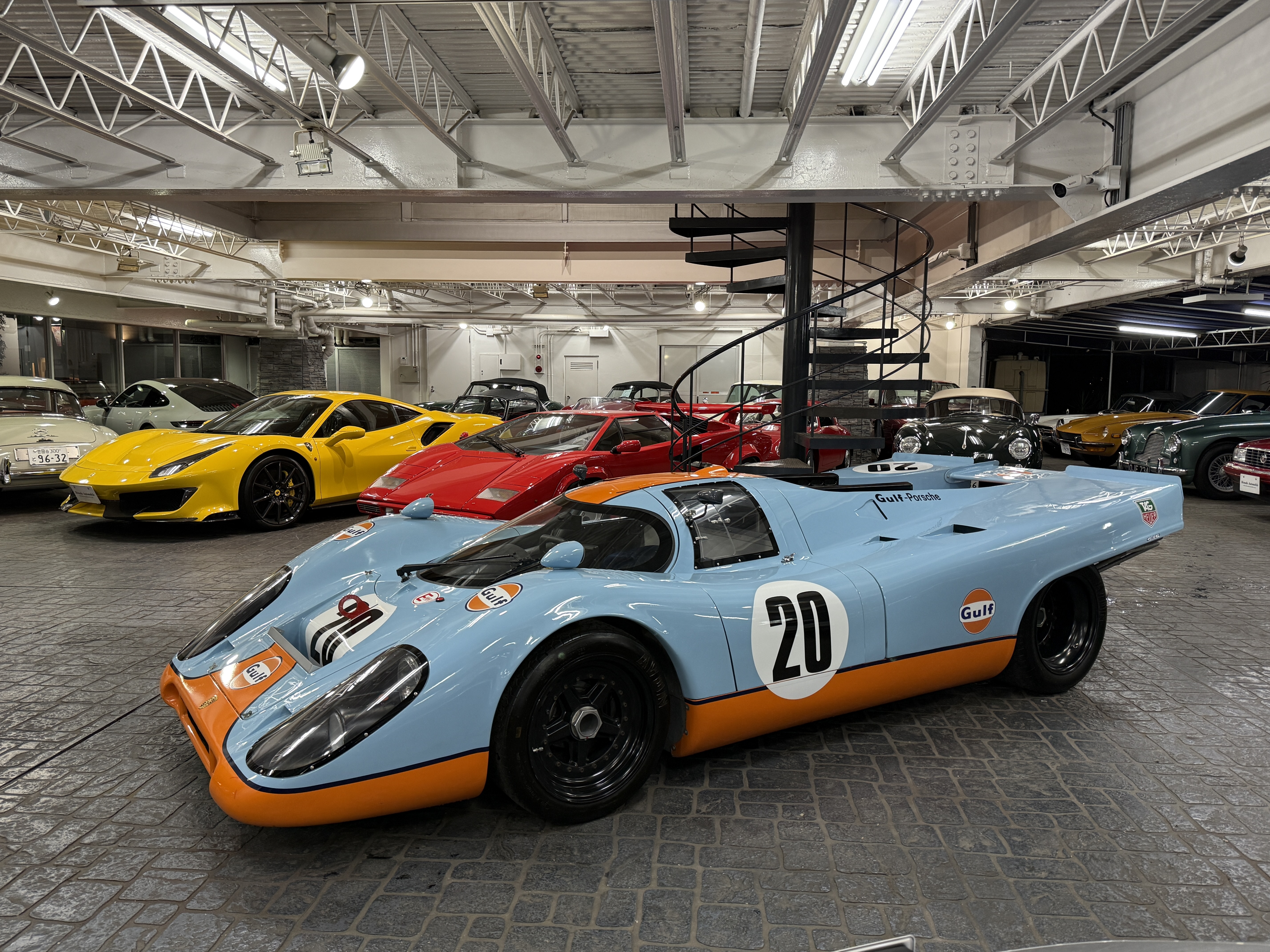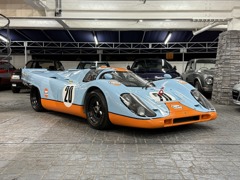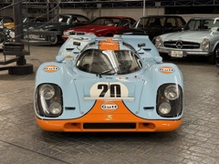 ︎オーストリアのグミュントでフェルディナント・ポルシェにより1931年4月25日に設立された「ポルシェ設計事務所」から始まり、第二次世界大戦後フェルディナント・アントン・エルンスト・ポルシェ(フェリー・ポルシェ)により、スポーツカー「356」が誕生する。7万8千台の「356」が生産され、1963年になるとフェルディナント・アレクサンダー・ポルシェ(ブッツィー・ポルシェ)のデザインによる「911」が発表される。スポーツカー・メーカーとして着実にその知名度を高めるとともに、レースの世界においても数多くの勝利を手にしてきたポルシェだったが、伝統的なスポーツカー・レースのひとつとなる「ル・マン24時間レース」での総合優勝は果たせずにいた。1968年にFIA(国際自動車連盟)によりメイクス・チャンピオンシップのレギュレーション変更が行われ、それまで無制限だった搭載エンジン排気量が3ℓ以下に制限された。これを好機と捉えたポルシェは、このレギュレーションに合わせて3ℓエンジン搭載の「908」を開発、しかし3ℓエンジン搭載車によるエントリーが少なかった事から、FIAは5ℓエンジン搭載車も「年間25台の生産」を条件に追認される事となり、1968年の「ル・マン」と、年間タイトルは「フォードGT40」のものとなってしまう。「ル・マン」制覇を目指していたポルシェは、1968年の「ル・マン」終了直後の7月から、僅か10ヶ月の開発期間を経て、その持てる技術を結集し新型の水平対向12気筒エンジンを搭載した新たなレーシングモデル「917」を25台作製した。ポルシェ初となる大排気量エンジン搭載の「917」は「906」から始まるポルシェ製レーシングモデルの忠実な発展形となり、単体重量42kgと超軽量な鋼管フレームに、低重心の水平対向エンジンを搭載、軽いFRP外皮を被せ空気抵抗を低減した成り立ちをもつ。その緻密な設計と開発の仕方は、ポルシェそのものとなり、1965年にポルシェ技術部門長に就任したフェルディナント・ピエヒ(フェルディナント・ポルシェの孫)の指揮のもと「906」開発段階から、エンジン・シャーシの設計を担ってきたハンス・メツガーが中心となりすすめられた。「917」のホイールベースは「908」と共通の2300mmとなり「904」「906」「910」とも等しく、フラット6を2基連結したイメージの12気筒エンジンをミッドに低く搭載する事で、ドライバーは必然的に前方に座らされる設計となっている。︎開発当初のエンジンは、ボア×ストローク85mm×66mmから4494ccの排気量をもつ180°V型12気筒DOHC24バルブとなり、向かい合うピストンは共通のクランクピン用いる為、メインベアリングは8個とし全長を抑えた設計となる。クランクケースとカムケースはマグネシウム製で、チタン製コンロッド、鍛造ピストン、クロマル(クロームメッキの施されたアルミ製)製ライナーが使用され、それぞれ1つずつの吸排気バルブと半球型燃焼室が採用されている。各気筒2本のツイン・プラグ方式とボッシュ製燃料噴射装置を備え、最高出力580馬力/8400rpmと最大トルク52kgm/6600rpmを発揮する。このタイプ912とよばれるエンジンはクラッチ抜きで240kgと極めて軽量に設計されたものとなっている。このエンジンのパワーは185mmのトリプル・プレート・クラッチを介して5速(4速も存在する)+リバースのマグネシウム鋳造製トランスアクスルに伝えられる。車両重量は780kgに仕上げられ、レギュレーションによる最低重量800kgには届かない為、バラストを必要としていた。︎足回りはフロントはダブルウィッシュボーン式でマグネシウム製アップライトを備える。リアはロアーウィッシュボーン+ラテラル・トップリンク+ラジアスアームとなり、前後ともにスタビライザーを備える。ショックアブソーバーはビルシュタイン製で、チタニウム製コイルスプリングと組み合わされている。ブレーキは前後共に、12インチ径のベンチレーテッド・ディスクに、ガーリング製4ポッドキャリパーが組み合わされている。ホイールサイズは、前・10.5インチ幅×15インチ径、後・17インチ幅×15インチ径が採用されている。︎1969年3月のジュネーブショーで発表された「917」は、熟成が足らずに信頼性が低く、極めて操縦が難しいといわれながらも「スパ1000km」でレース・デビューを飾る。ゲルハルト・ミッター/ウド・シュッツ組により出走するが、僅か1周でギアボックス・トラブルによりリタイア。3週間後の「ニュルブルクリンク1000km」にも1台の「917」が送り込まれ、8位を獲得。そして迎えた初めての「ル・マン」でもドライバビリティの改善は見られず、それでも予選では前年の記録を12秒も縮めるラップタイムを記録し、ミュルザンヌのストレートでは他の出場車両より50km/h以上も早い最高速度を実現、驚異的なポールタイムを披露して見せた。このレースには2台のワークス「917」が出場し、1台は3時間レースを戦ってギアボックス・トラブルでリタイア。もう1台は首位の座を快走し続けるが、残り4時間というところで2位に4周の大
