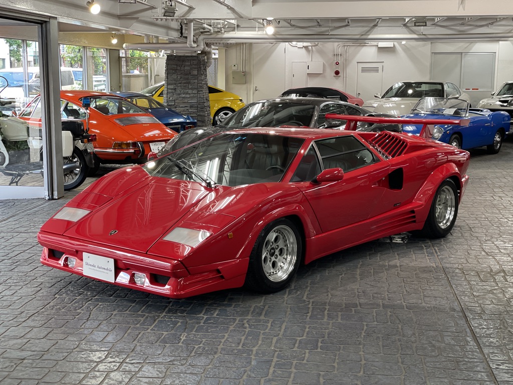 「カウンタック・アニバーサリー」のデビューは1988年9月8日、新たにランボルギーニ社の経営権を手に入れたクライスラー社社長リー・アイアコッカ、並びにランボルギーニ創業者フェルッチオ・ランボルギーニ参列のもと挙行された「ランボルギーニ社創立25周年記念式典」のイタリアはパルマに近い会場であった。ショー・デビューは同じ月のパリ・サロンとなる。パワートレインは、それまで製造されていた「5000クワトロバルボーレ」を踏襲しながら、リニューアルされたエクステリア、及びインテリアを持つ。フロントエアダム、サイドスカート、前後バンパー、アグレッシブなボディショルダー部のエアスクープなどが専用デザインをもつ「カウンタック」の最終進化モデルとなる。「カウンタック」のデザインはカロッツェリア・ベルトーネに在籍したマルチェロ・ガンディーニによるものとなるが「カウンタック・アニバーサリー」の専用エクステリアのデザインは、オラチオ・パガーニによるもの。1955年アルゼンチンに生まれたパガーニは、カーデザイナーを目指し大学でデザインとエンジニアリングを学んだ。その後、5回のF1チャンピオンの経歴をもつ、同郷のファン・マヌエル・ファンジオをたより1982年ランボルギーニ社に入る。「LM002」「カウンタック・アニバーサリー」開発に携り、複合素材の知識に明るくカーボンファイバー素材の市販車への導入を図り、チューブラーフレームでは無くカーボンフレームをもつ「カウンタック・エボルツィオーネ」を製作するまでになった。その技術は「カウンタック・アニバーサリー」にも活かされ、ボディシェルの一部に複合素材が使用される初の市販車とされた。1992年オラチオ・パガーニは独立し1999年には「パガーニ・ゾンタ」を発表する。「カウンタック」登場時の「LP400」の設計はパオロ・スタンツァーニによるもので、1968年「ミウラ」のグレードが「S」から「SV」に進化するタイミングで始まっていた。シャーシ開発のジャンパオロ・ダラーラの「試作車を販売してしまった」という発言どおり「ミウラ」での熟成度と信頼性を確立出来なかったという反省から「カウンタック」の開発に時間をかけたかったのだろう。プロトタイプとなる「LP500」は鋼板モノコック構造となっていたが、強度と重さの関係から、市販車となる「LP400」では作り慣れたチューブラーフレーム構造に変更された。そのフレームはマルケジーニ社に、外皮となるアルミパネルはトリノのITCA社に発注された。出来上がったチューブラーフレームは、直径40mmの円断面鋼管によるトラス構造を基本に、ため息が出る程複雑精緻に組み上げたもので、工芸品ともよべる贅沢でオーバークオリティなものとなっている。それにも増して鮮やかなのは、パワートレインレイアウト。「ミウラ」のV12エンジン横置きレイアウトは、リアヘビーとスペースの関係からサスペンションアーム設計の自由度に欠けた事により「カウンタック」では縦置きとされた。しかも、通常の縦置きとは前後逆に配置し、ボディ前方に向かってクラッチ、トランスミッションと並べてある。前方にアウトプットされた出力は、エンジン直下のウェットサンプのオイルパンの中をドライブシャフトが貫通し、リアデフに伝達されるという斬新なレイアウトとなる。スタンツァーニはこの設計でV12エンジン縦置きと、短いホイールベース内にパワートレインを納めるという事を両立してみせた。「カウンタック・アニバーサリー」にもこのチューブラーフレームとパワートレインレイアウトが継承されている。エンジンは「フェラーリ250GTO」の開発で名を馳せたジオット・ビッザリーニ設計によるものを基本としたもの。V12エンジンとしては極めてコンパクトな外寸をもち、ひたすらパワー志向で仕立てられ、原初設計3.5ℓで「ミウラ」搭載時に、ビッザリーニの後を引き継いだジャンパオロ・ダラーラにより4ℓ化され「カウンタックLP400」にも搭載された。4ℓ化された時点で基本設計からの伸びしろを使い果たしたこのエンジンを、マセラティからランボルギーニの技術チーフに就任したジュリオ・アルフィエーリが救う事になる。ジュリオ・アルフィエーリは1961年にフェラーリからジャンパオロ・ダラーラを引き抜きマセラティで育てた人物。ダラーラは、その後ランボルギーニに移籍し「ミウラ」で脚光を浴びるが、アルフィエーリはその裏で「マセラティ・ボーラ」を地道に開発していた。そのアルフィエーリが、ランボルギーニの伸び代を使い果たしたエンジンのブロックとシリンダーヘッドの間にアルミスペーサーを挿入し、ストローク延長の余裕を与えた。これにより「カウンタック・アニバーサリー」に搭載される5.2ℓまで拡大されるのに留まらず、次期モデル「ディアブロ」にも5.7ℓ化されて搭載されることとなった。「カウンタック・アニバーサリー」に搭載されるエンジンは60°V12気筒DOHC48バルブとなり