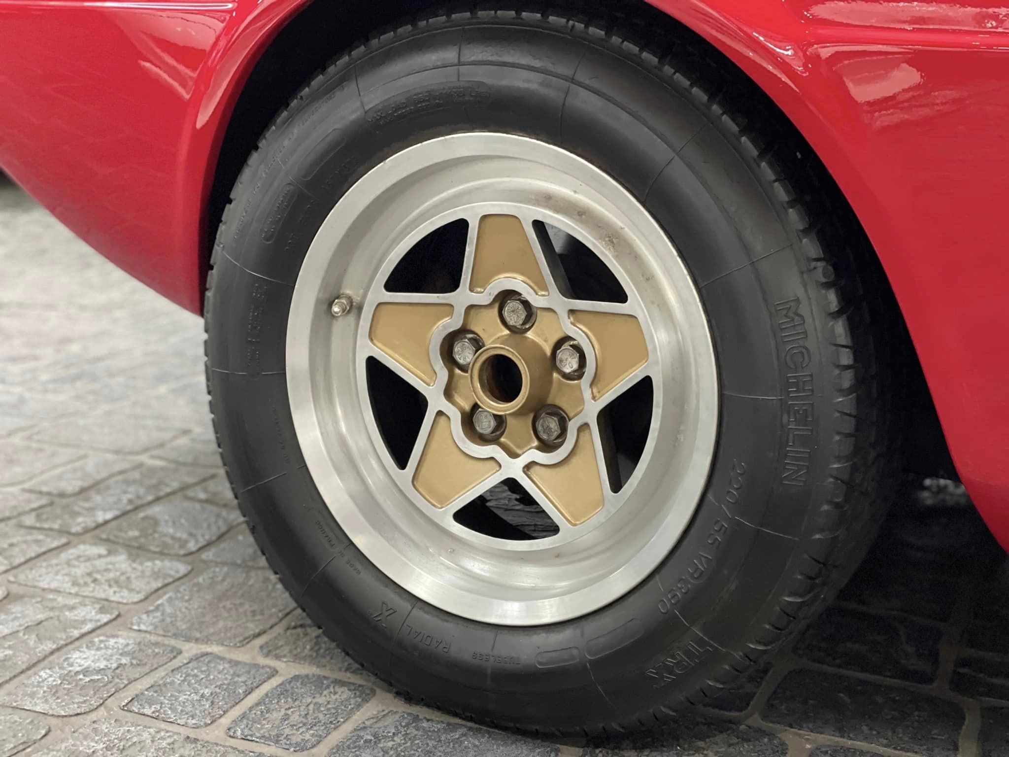 ディーノ208GT4の母体となる、308GT4がデビューしたのは1973年10月のパリサロン。この年に生産中止となったディーノ246GTの、ブランド名を引き継ぐかたちでデビューした308GT4は、そのネーミングからもわかる様に、新開発となる3.0ℓV型8気筒を搭載した、グランツーリスモで4は2+2形式で4人乗りをあらわしている。創業者エンツォ・フェラーリは、当時「12気筒でなければフェラーリでは無い」と公言していたので、まさにその通りとなった。むしろディーノ246GTの後継というのであれば、1975年デビューとなる308GTBの方がイメージ通り、おさまる気がするが、こちらは12気筒以外で初めてフェラーリのエンブレムを冠されるクルマとなった。この308GTBがデビューした1975年10月のパリサロンに於いて、デビューしたのが208GT4となる。ボディデザインはカロッツェリア・ベルトーネに任され、デザイナーは多くのランボルギーニ をデザインした、マルチェロ・ガンディーニによるもの。フェラーリ生産車としては唯一のベルトーネ・デザイン(ショー・モデルとしては308レインボーが存在し、同じくガンディーニによるデザイン)となっている。この頃のイタリアのスポーツカーメーカー各社は、こぞって北米でのポルシェ911の成功に着目しながら、2+2ボディを持つミッドシップスポーツカーの開発に傾倒していた。ランボルギーニ はウラッコが、マセラティはメラクが、そしてフェラーリは308GT4がそのポジションに存在した。また、208GT4と同様に、これらのモデル達は揃ってイタリア国内仕様として、それぞれに2ℓモデルをそのバリエーションに加えていた。これはイタリア国内において2ℓ以上のモデルに掛けられる38%にものぼる、付加価値税を嫌っての対策ともいえる。208GT4が搭載するエンジンは、90°V型8気筒DOHC16バルブで、F106C型と呼ばれるボア×ストロークが、66.8mm×71mmの1991ccとなる。圧縮比9.0とダウンドラフトのツイン・チョーク・ウェーバー34DCNFを4基備え、ウェット・サンプながら170馬力/7700rpmと19kgm/4900rpmのトルクを発揮する。このエンジンの3ℓ版を搭載する308GT4とは、多くの部分を共有するが、シリンダーボアは3ℓ版の81mmから66.8mmに縮小され、圧縮比は8.8から逆に9.0と高められている。排気量が1ℓ縮小される事で出力は低下するが、そのエンジンフィールにおいて、それぞれのエンジンのキャラクターを明確に分けているようだ。3ℓ版はトルク型となり、2ℓ版は回転型とされ、208GT4のエンジンは「ディーノ」の名に相応しいアクセルレスポンスと高回転を好む性格が与えられている。組み合わされるギアボックスは5MTのみとなるが、3ℓ版よりファイナルギアレシオを低くセッティングする事でエンジンのキャラクターを活かしつつ、限りあるパワーを補う工夫がなされている。足回りは3ℓ版と同じく4輪ダブルウィッシュボーンの型式をとるが、そのセッティングはエンジン特性を考慮して208GT4独自のものとなっている。ブレーキは4輪ともベンチレーテッドディスクを装備し、タイヤサイズはワンサイズ細い195/70-14となる。今回、入荷した個体はホイール・タイヤともに、308GTBクワトロ・ヴァルヴォーレに使われる220/55VR390サイズのミシュランTRXタイヤとホイールによりカスタマイズされている。インテリアはベルトーネ・デザインならではと言える手法をインパネに見る事が出来る。ドライバー正面のモモ製ステアリングを通して見える大型メータークラスターがそれ。中央にメーター類全てをおさめた一枚と、左右に小型のパネルが角度を付けて配置され、3枚連なるデザインはランボルギーニ・ウラッコの様だ。ここに使われるヘアライン入りのアルミパネルは、308GT4ではアルミの地色となるシルバーだが、208GT4ではブラック仕上げとされている。中央パネル左に大径のスピードメーター、右にタコメーター、その間に左から油圧計、時計、水温計とV型に3つの小径メーターを配置。大径メーターの外にそれぞれ一つずつ左に燃料計、右に油温計が配置され、メーターは全てVeglia製となっている。更に左側のパネルには、タンブラースイッチとインジケーターランプ、右側のパネルは空調レバーが備わっている。308GT4と208GT4の外観上の違いは、四角いフロントグリル両脇にフォグランプが付くのが308GT4となる。208GT4にはフォグランプは無くシンプルなフロントまわりとなっている。リアに視線を移すと4本出しANSA製マフラーが付くのが308GT4、シンプルに左側から1本出しとなるのが208GT4。このシングルパイプのマフラー、見かけとは異なりディーノ246GTより乾いた甲高いフェラーリサウンドを発する。今回入荷した個体には308GT4と同様にスポーティな4本出しANSA製マフラーが装備されている。208GT4の全長×全幅×全高は4300mm×1790mm×1210mm、ホイールベースは2550mm、トレッドは前後ともに1460mm、車両重量は308GT4より55kg軽量となる1310kgとなっている。メーカー公表性能値は、0→400m加速16.0秒、最高速度220km/hとなり、308GT4のカーグラフィック誌