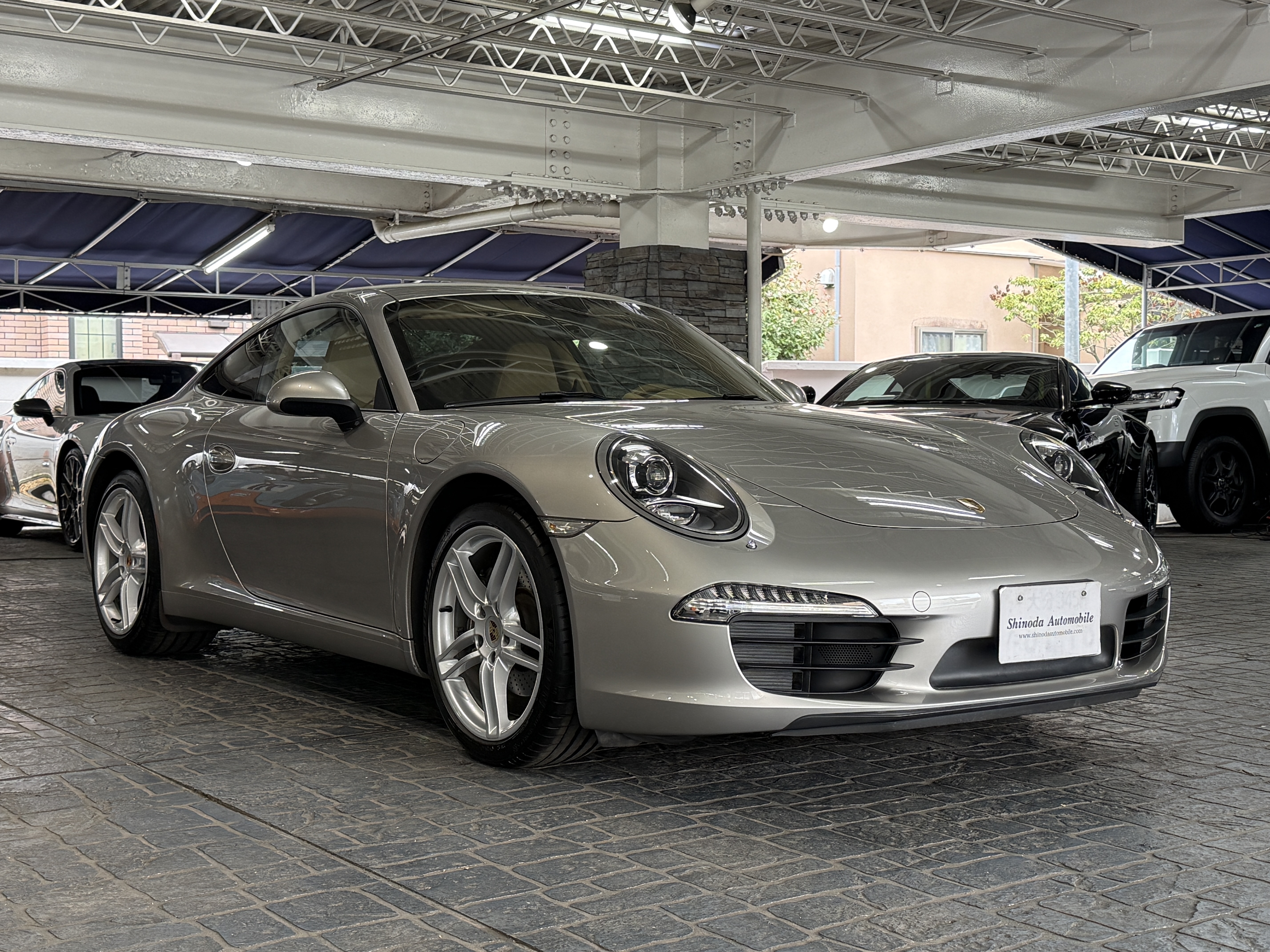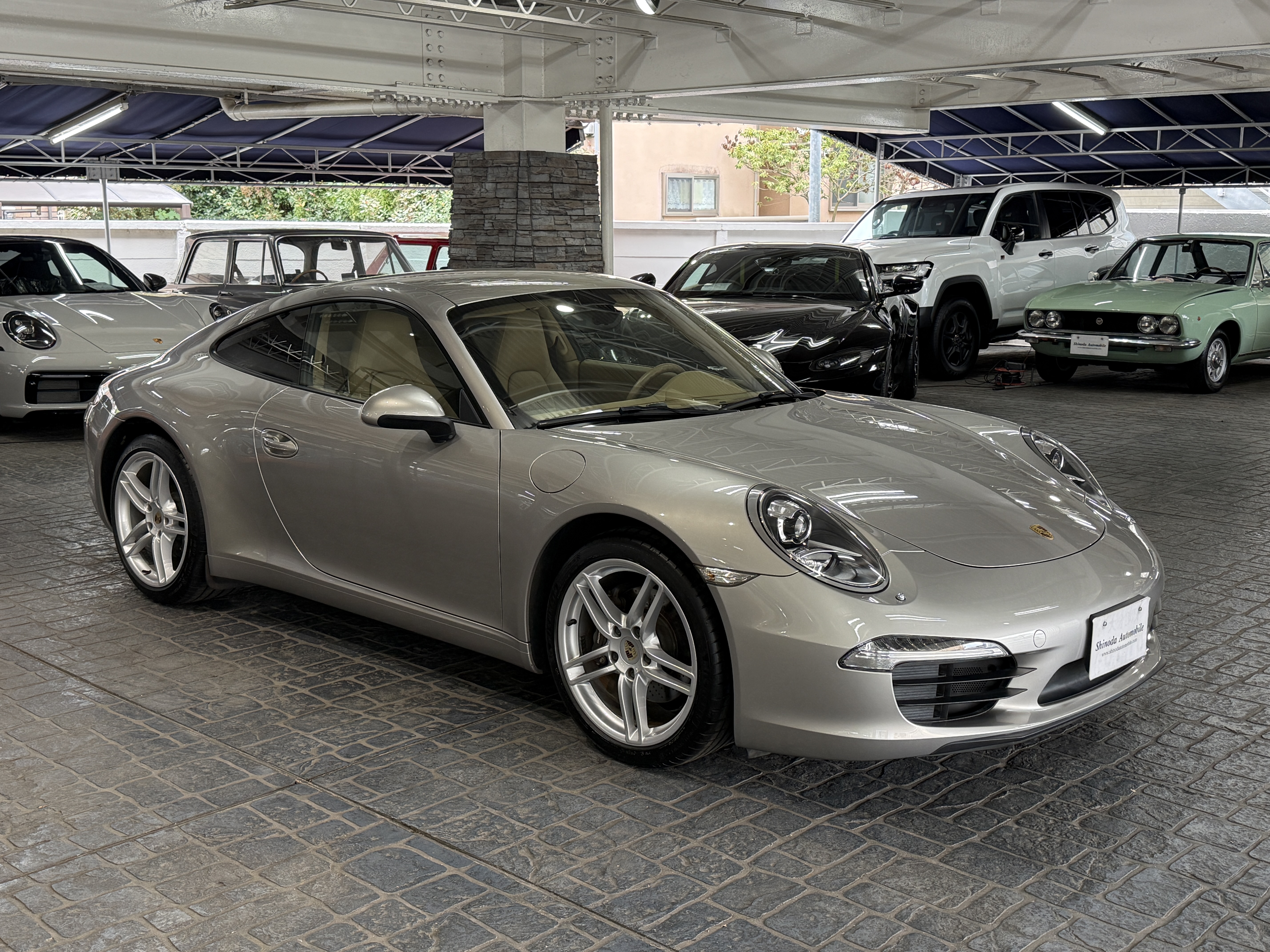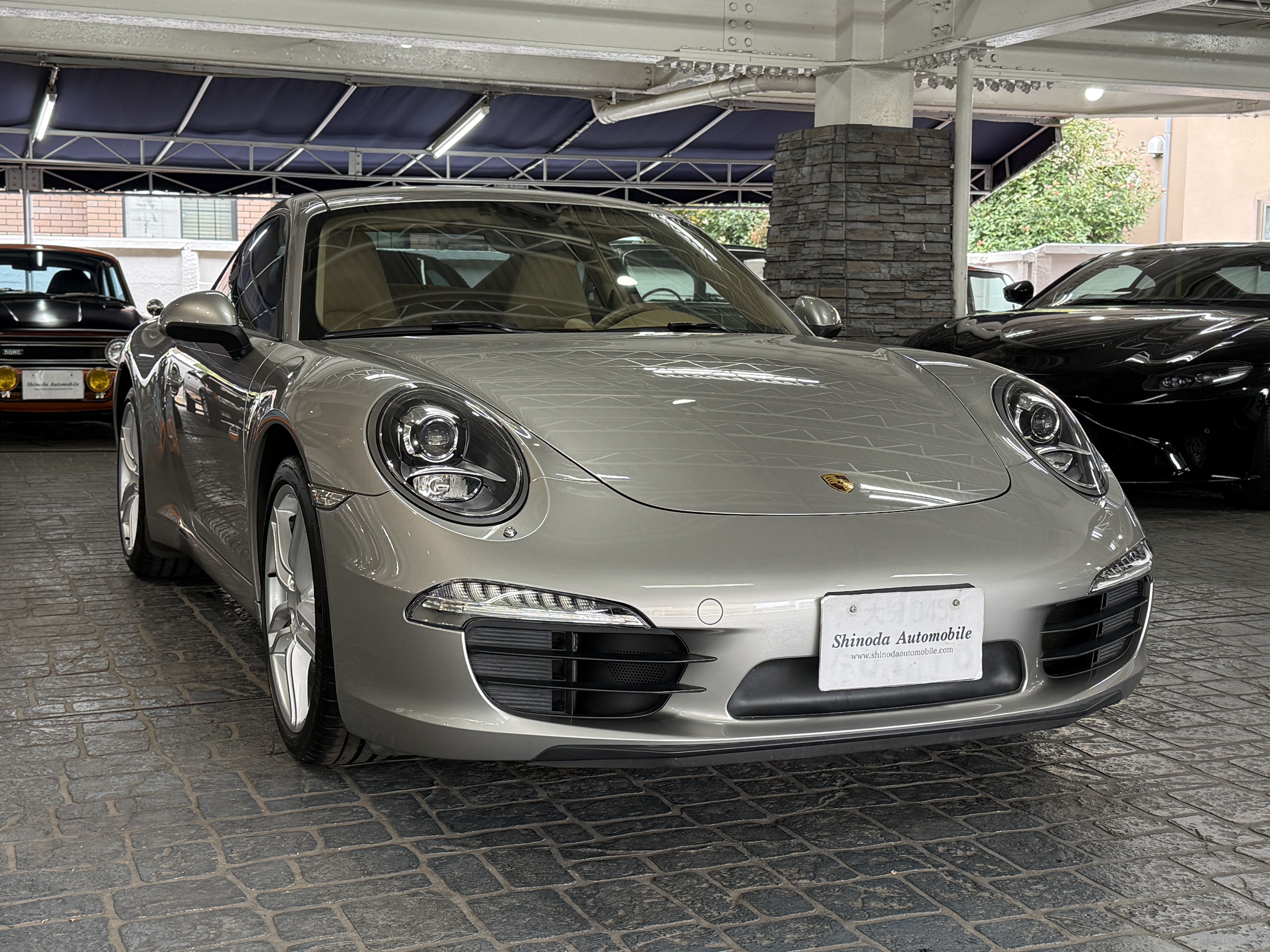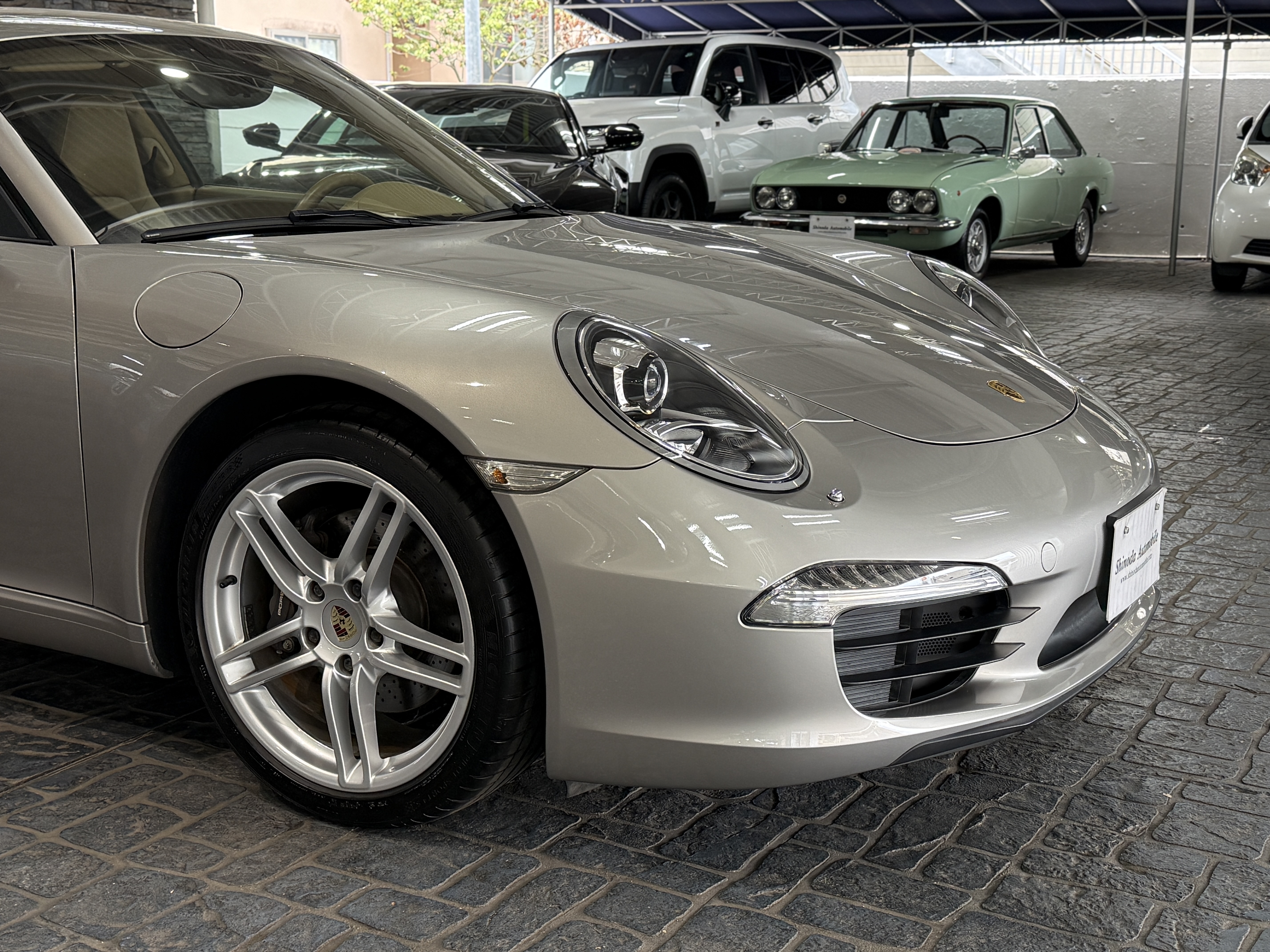 ︎2011年8月29日、ドイツ南部の街、シュツットガルト近郊の本社に隣接するポルシェ博物館で「911カレラ・スニークプレビュー」が開催され「991型カレラ」はそこではじめて公開された。先代となる「997型カレラ」から「998型」と型式を継承しなかったのは、続き番号にすることで開発中の部品が次期「911」のものと漏洩してしまうのを防ぐためと「997型」のエボリューションモデルでは無く、それ以上に大きな変化・進化が込められた事による。先代の「997型カレラ」に比べ一挙に大型化されるという事前情報が広まる中で、車幅はほぼ同寸の1808mm、全長も56mmという僅かな増加に留まり、ボディサイズの大きな変更は行われなかった。大きくなったように見えるとすれば、100mm延ばされたホイールベースと、拡大されたフロントトレッド、それに伴いより幅広い間隔で、外側にレイアウトされた「911」の特徴となる丸型のヘッドライトによるもの。LEDテクノロジーを用いたテールランプは、シャープな薄型形状とされリア回りはランプ上方レベルで、リアエンドを取り巻く水平ラインが強調され、先代との変化がわかりやすい。ルーフラインが数ミリ下げられ、ウィンドウグラフィックがスリークな形状にリファインされることで、伸びやかで「モダンな911」というイメージのボディデザインは、より「911」らしいデザインを追求した結果だといわれている。そのボディデザインは、メルセデスベンツで初代「SLK」を手がけ「スマート」や「サーブ」を経て2004年にポルシェ・デザイン部門に移籍し、「993型カレラ」をデザインしたハーム・ラガーイの後任としてチーフとなったミハエル・マウアーによるもの。マウアーはナロー時代の「911」がもつ美しいシルエットを意識しつながら、リアフェンダーの織りなす曲面や、丸型ヘッドライトカバーにバブル形状の膨らみを持たせるなど、細部にわたりこだわったデザイン表現を用いている。「991型カレラ」の正式なショーデビューは2011年9月のフランクフルトショーとなる。前世紀末にフラット6エンジンが水冷化され「996型カレラ」として登場した「911」は、キープコンセプトともいえる「997型カレラ」に進化した後、この「991型」では久しぶりの「フルモデルチェンジ」に近い、使用部品の95%が刷新された「911」となっている。先代までの頑強な鋼板製のモノコックボディは、様々な種類のスチールに加え、アルミやマグネシウムなどを用いたハイブリッド構造となり、モノコック単体で45kg軽く仕上げられている。フロントフェンダー、トランク・フード、ドア、リア・エンジンリッドはアルミ製とされ、インテリアトリムの樹脂素材の最適化により、さらなる軽量化もほどこされている。「991型」では先代に比べ、静的捩れ剛性で25%、動的捩れ剛性で20%、固有振動数で13%の向上が図られ、軽量化されながらも剛性アップも達成されている。ダイエットされたボディに対しパワーアップしたエンジンを搭載、組み合わされるギアボックスは、新型7段PDKと、これをベースに乗用車史上初となる7段MTが設定されている。新たに採用された電動パワーステアリングは、良好なタッチとナチュラルな感触により洗練されたフィーリングをもちながらも、路面からのキックバックが少なくおさえられ、古くからの「911」ファンには少し物足りなく感じられるかもしれない。120km/hで上昇し、80km/hで格納される電動式リア・スポイラーは、空力的に有効な範囲が898mmから1137mmに拡大され、サイドウィンドウ前端からドアパネルに移設したサイド・ミラーやフラット化されたフロアパネル、冷却システムの刷新により、ワイドタイヤ装着にもかかわらずCd値は0.29へと向上している。「964型」以降全ての「911」開発に携わり「991型」の開発も担当した、チーフ・プロジェクト・エンジニアのアウグスト・アハライトナーは「あらゆる重要な分野で991型は一歩前進している」とコメントを残している。また、2006年以降ポルシェの開発プロジェクト・チームに加わった伝説のラリー・ドライバー、ヴァルター・レアルは「991型は、バランスが良くドライバーに従順で、これ以上手の入れようの無いクルマ」と高い完成度を力説している。︎今回入荷した2012年式「911カレラPDK」に搭載されるエンジンは、MA104型とよばれるオールアルミ製の水冷式・水平対向直噴6気筒DOHC24バルブエンジンとなり、ボア×ストローク97mm×77.5mmで、3436ccの排気量を得る。MA104型エンジンは先代の「997型カレラ」が搭載するMA102型エンジンに比べ178cc少ない排気量となっている。これは、ボアは共通ながらストロークを「997型カレラS」用の3.8ℓ・MA101型のコンロッドを用いる事で4mmショート・ストローク化した事によるもの。排気量を下げながらも12.5の圧縮比をもち、最高出力は350馬力/7400rpm、最大トルク39.8kgm/5600rpmを発揮、「997型カレラ」に比べ、5馬力アップと同等のトルク値を実現している。排気量を縮小しながらもパフォーマンス・アッ
