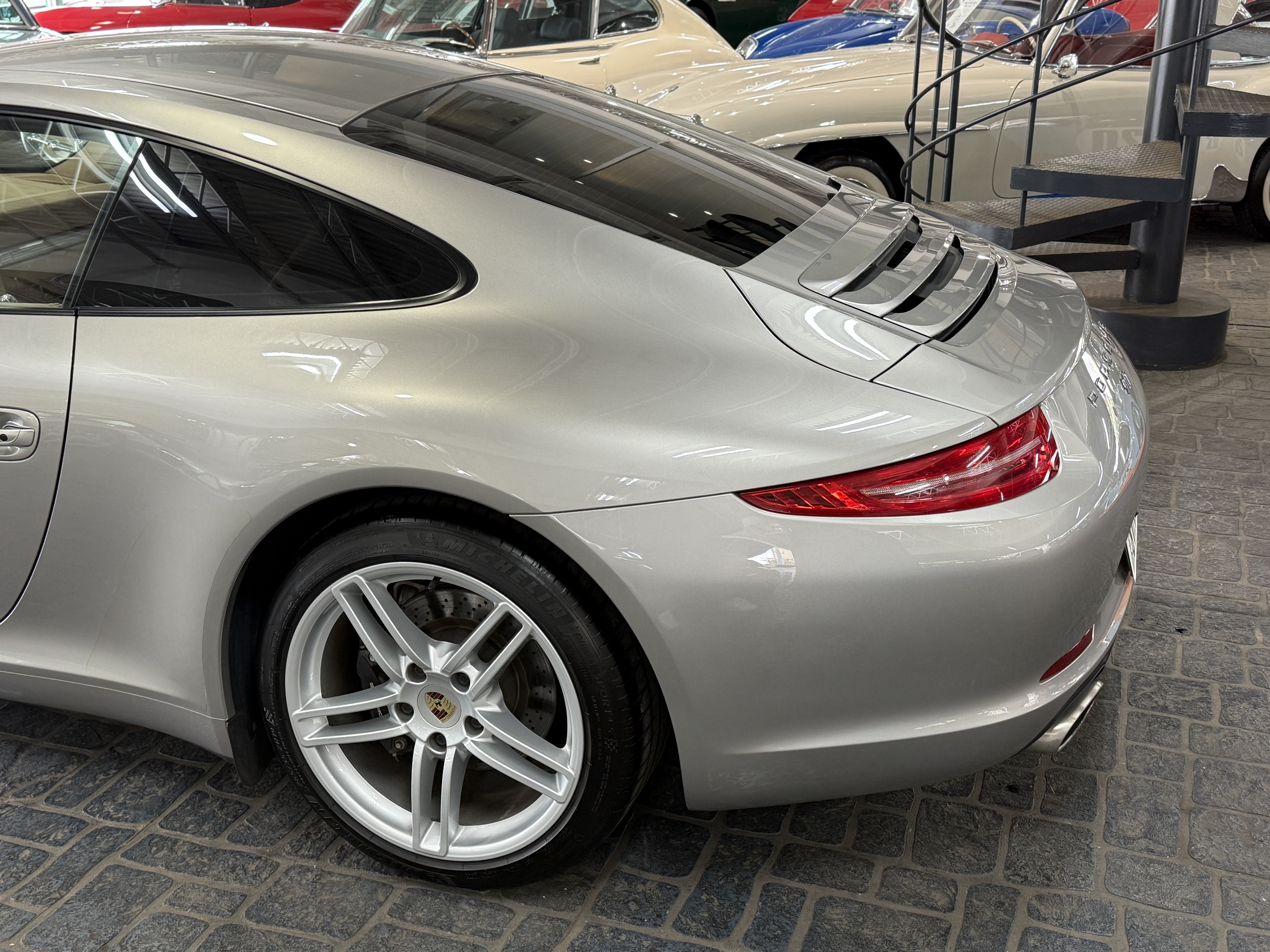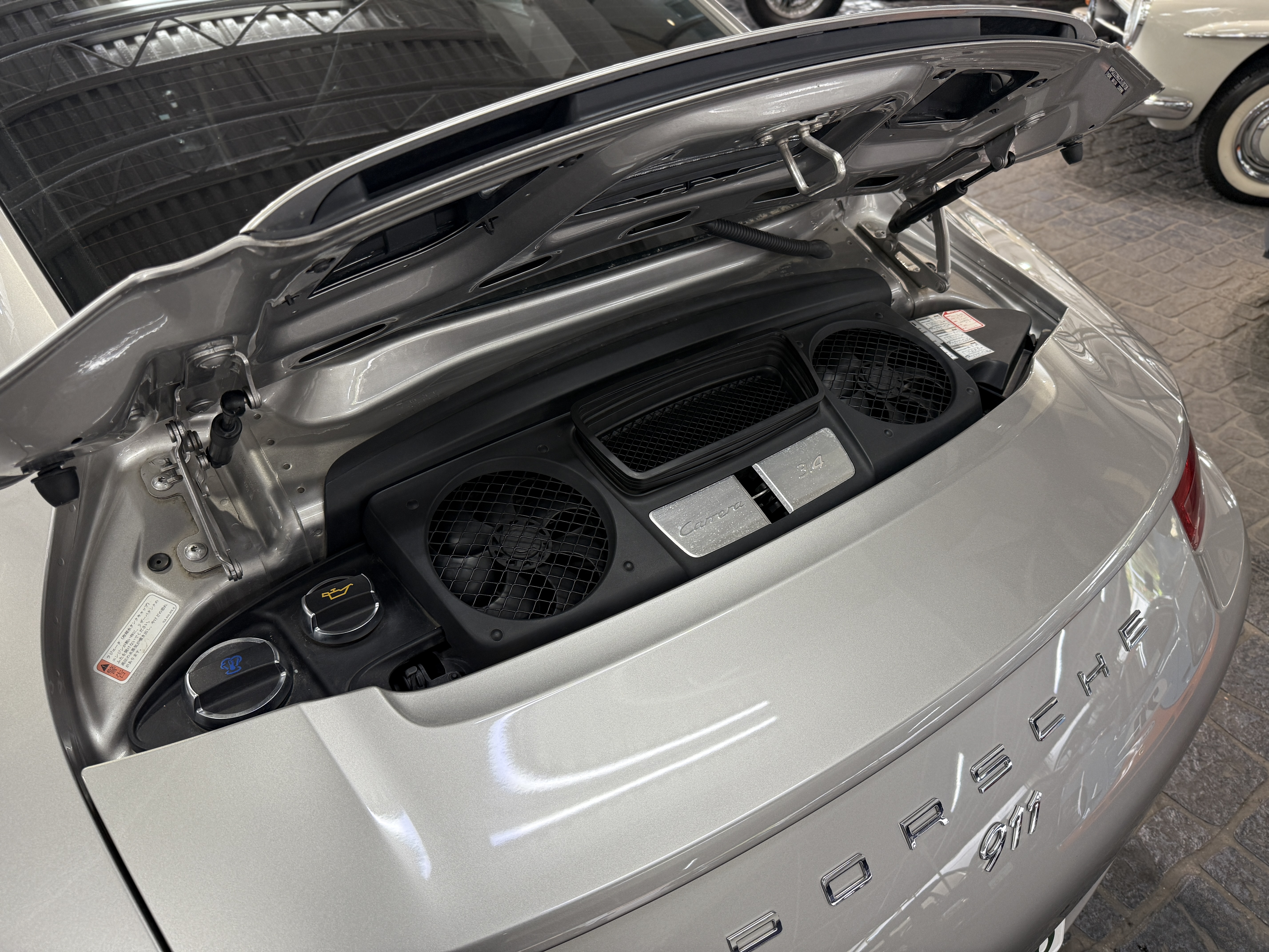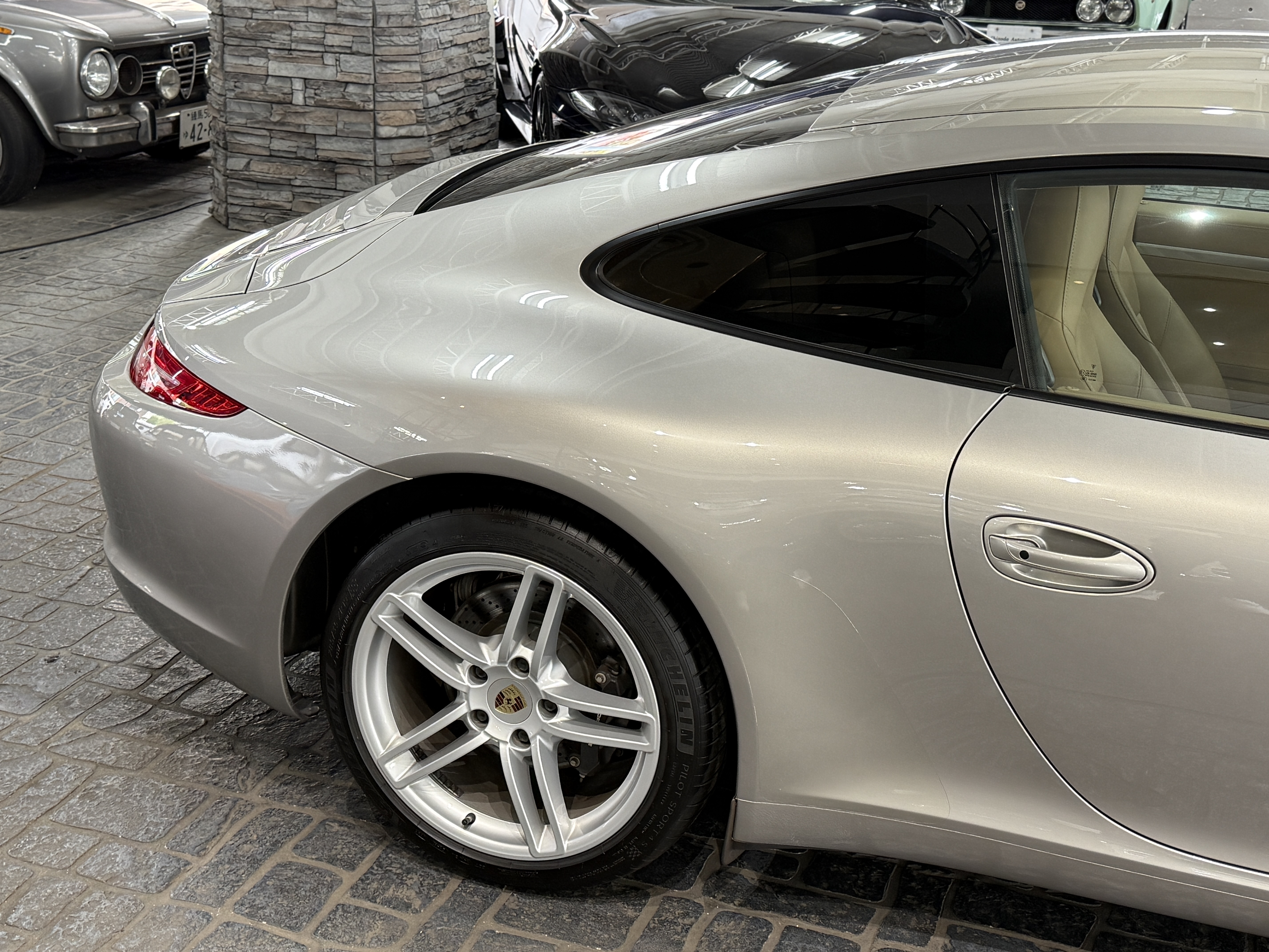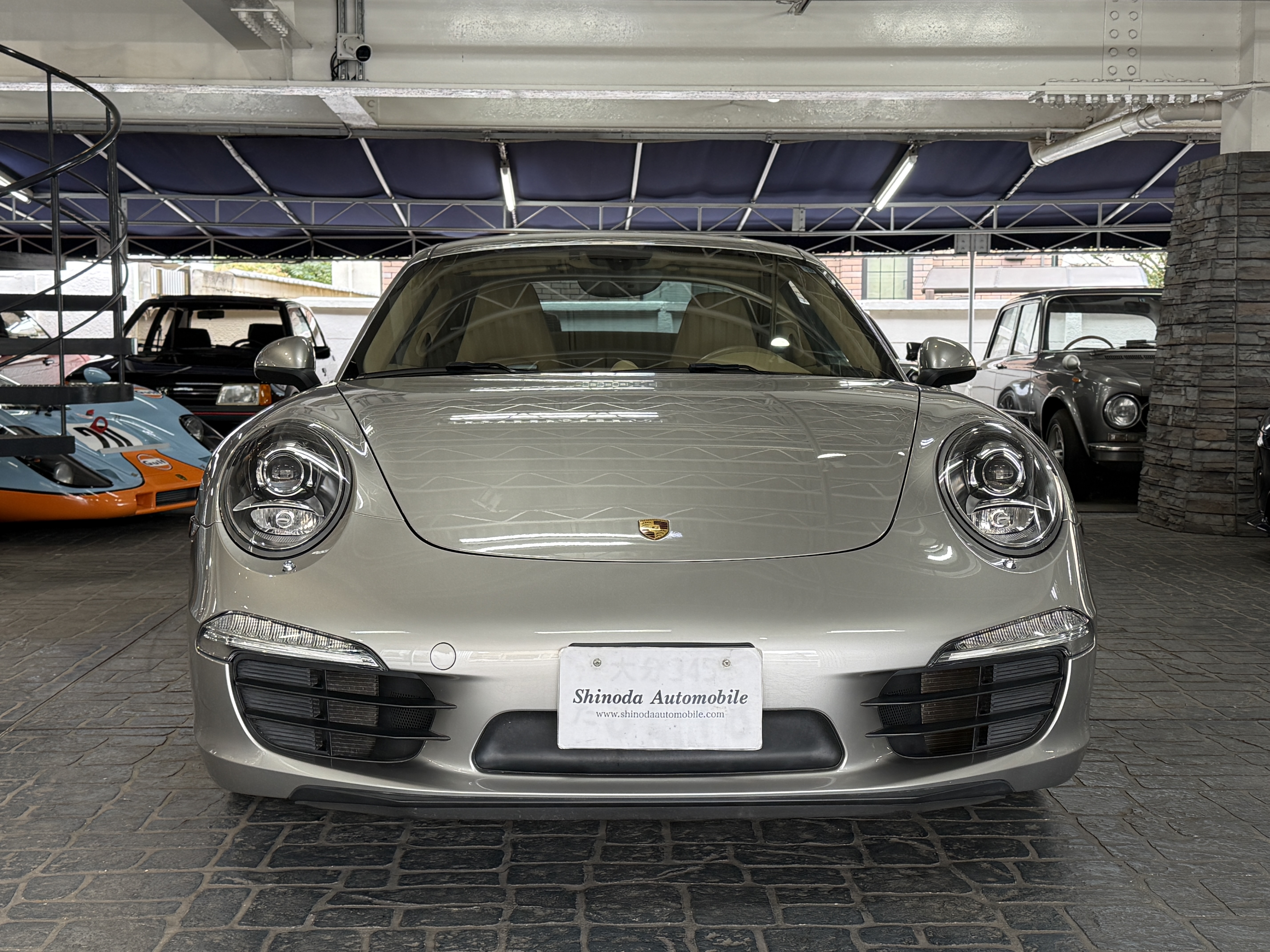 ︎2011年8月29日、ドイツ南部の街、シュツットガルト近郊の本社に隣接するポルシェ博物館で「911カレラ・スニークプレビュー」が開催され「991型カレラ」はそこではじめて公開された。先代となる「997型カレラ」から「998型」と型式を継承しなかったのは、続き番号にすることで開発中の部品が次期「911」のものと漏洩してしまうのを防ぐためと「997型」のエボリューションモデルでは無く、それ以上に大きな変化・進化が込められた事による。先代の「997型カレラ」に比べ一挙に大型化されるという事前情報が広まる中で、車幅はほぼ同寸の1808mm、全長も56mmという僅かな増加に留まり、ボディサイズの大きな変更は行われなかった。大きくなったように見えるとすれば、100mm延ばされたホイールベースと、拡大されたフロントトレッド、それに伴いより幅広い間隔で、外側にレイアウトされた「911」の特徴となる丸型のヘッドライトによるもの。LEDテクノロジーを用いたテールランプは、シャープな薄型形状とされリア回りはランプ上方レベルで、リアエンドを取り巻く水平ラインが強調され、先代との変化がわかりやすい。ルーフラインが数ミリ下げられ、ウィンドウグラフィックがスリークな形状にリファインされることで、伸びやかで「モダンな911」というイメージのボディデザインは、より「911」らしいデザインを追求した結果だといわれている。そのボディデザインは、メルセデスベンツで初代「SLK」を手がけ「スマート」や「サーブ」を経て2004年にポルシェ・デザイン部門に移籍し、「993型カレラ」をデザインしたハーム・ラガーイの後任としてチーフとなったミハエル・マウアーによるもの。マウアーはナロー時代の「911」がもつ美しいシルエットを意識しつながら、リアフェンダーの織りなす曲面や、丸型ヘッドライトカバーにバブル形状の膨らみを持たせるなど、細部にわたりこだわったデザイン表現を用いている。「991型カレラ」の正式なショーデビューは2011年9月のフランクフルトショーとなる。前世紀末にフラット6エンジンが水冷化され「996型カレラ」として登場した「911」は、キープコンセプトともいえる「997型カレラ」に進化した後、この「991型」では久しぶりの「フルモデルチェンジ」に近い、使用部品の95%が刷新された「911」となっている。先代までの頑強な鋼板製のモノコックボディは、様々な種類のスチールに加え、アルミやマグネシウムなどを用いたハイブリッド構造となり、モノコック単体で45kg軽く仕上げられている。フロントフェンダー、トランク・フード、ドア、リア・エンジンリッドはアルミ製とされ、インテリアトリムの樹脂素材の最適化により、さらなる軽量化もほどこされている。「991型」では先代に比べ、静的捩れ剛性で25%、動的捩れ剛性で20%、固有振動数で13%の向上が図られ、軽量化されながらも剛性アップも達成されている。ダイエットされたボディに対しパワーアップしたエンジンを搭載、組み合わされるギアボックスは、新型7段PDKと、これをベースに乗用車史上初となる7段MTが設定されている。新たに採用された電動パワーステアリングは、良好なタッチとナチュラルな感触により洗練されたフィーリングをもちながらも、路面からのキックバックが少なくおさえられ、古くからの「911」ファンには少し物足りなく感じられるかもしれない。120km/hで上昇し、80km/hで格納される電動式リア・スポイラーは、空力的に有効な範囲が898mmから1137mmに拡大され、サイドウィンドウ前端からドアパネルに移設したサイド・ミラーやフラット化されたフロアパネル、冷却システムの刷新により、ワイドタイヤ装着にもかかわらずCd値は0.29へと向上している。「964型」以降全ての「911」開発に携わり「991型」の開発も担当した、チーフ・プロジェクト・エンジニアのアウグスト・アハライトナーは「あらゆる重要な分野で991型は一歩前進している」とコメントを残している。また、2006年以降ポルシェの開発プロジェクト・チームに加わった伝説のラリー・ドライバー、ヴァルター・レアルは「991型は、バランスが良くドライバーに従順で、これ以上手の入れようの無いクルマ」と高い完成度を力説している。︎今回入荷した2012年式「911カレラPDK」に搭載されるエンジンは、MA104型とよばれるオールアルミ製の水冷式・水平対向直噴6気筒DOHC24バルブエンジンとなり、ボア×ストローク97mm×77.5mmで、3436ccの排気量を得る。MA104型エンジンは先代の「997型カレラ」が搭載するMA102型エンジンに比べ178cc少ない排気量となっている。これは、ボアは共通ながらストロークを「997型カレラS」用の3.8ℓ・MA101型のコンロッドを用いる事で4mmショート・ストローク化した事によるもの。排気量を下げながらも12.5の圧縮比をもち、最高出力は350馬力/7400rpm、最大トルク39.8kgm/5600rpmを発揮、「997型カレラ」に比べ、5馬力アップと同等のトルク値を実現している。排気量を縮小しながらもパフォーマンス・アッ