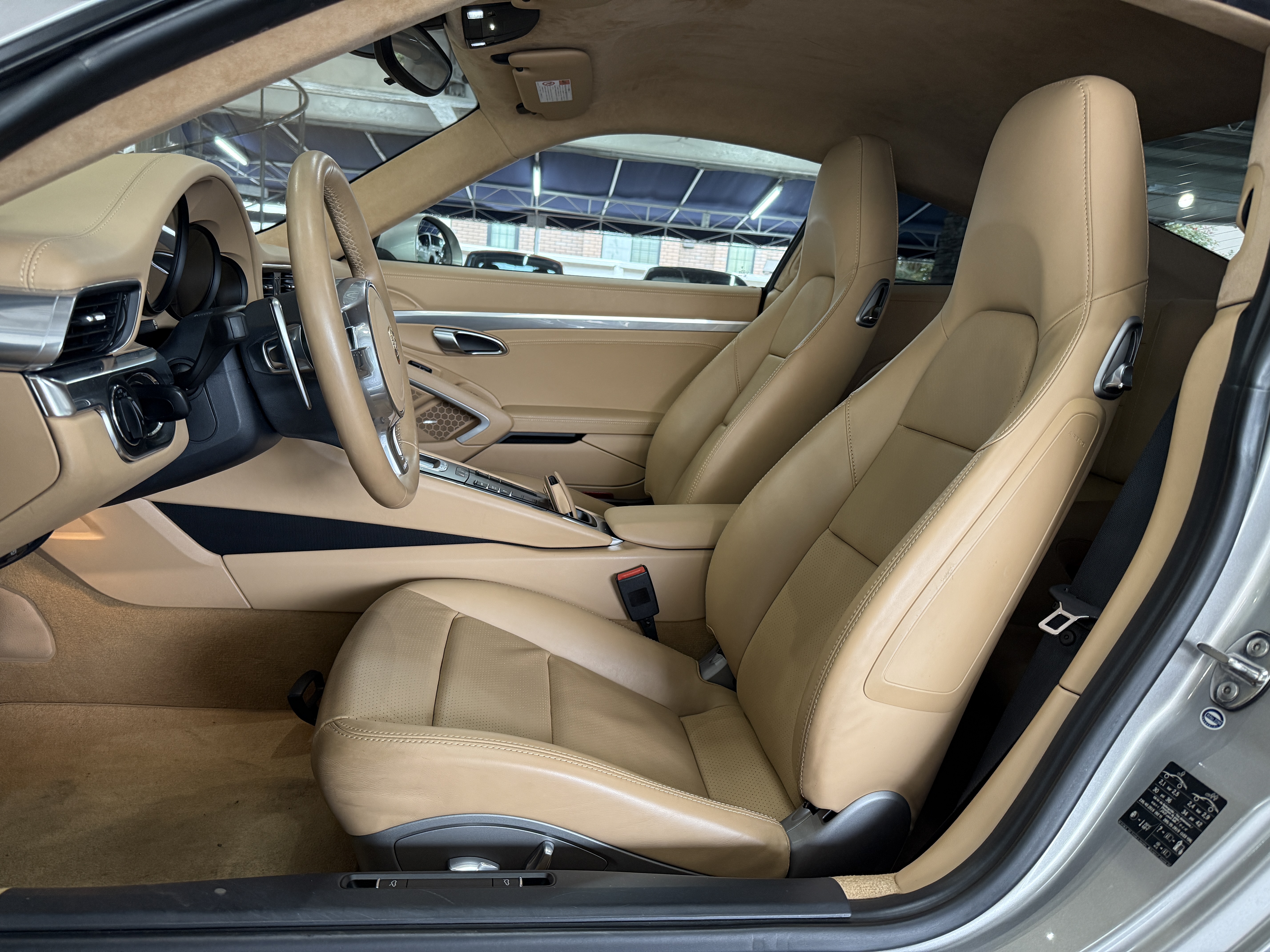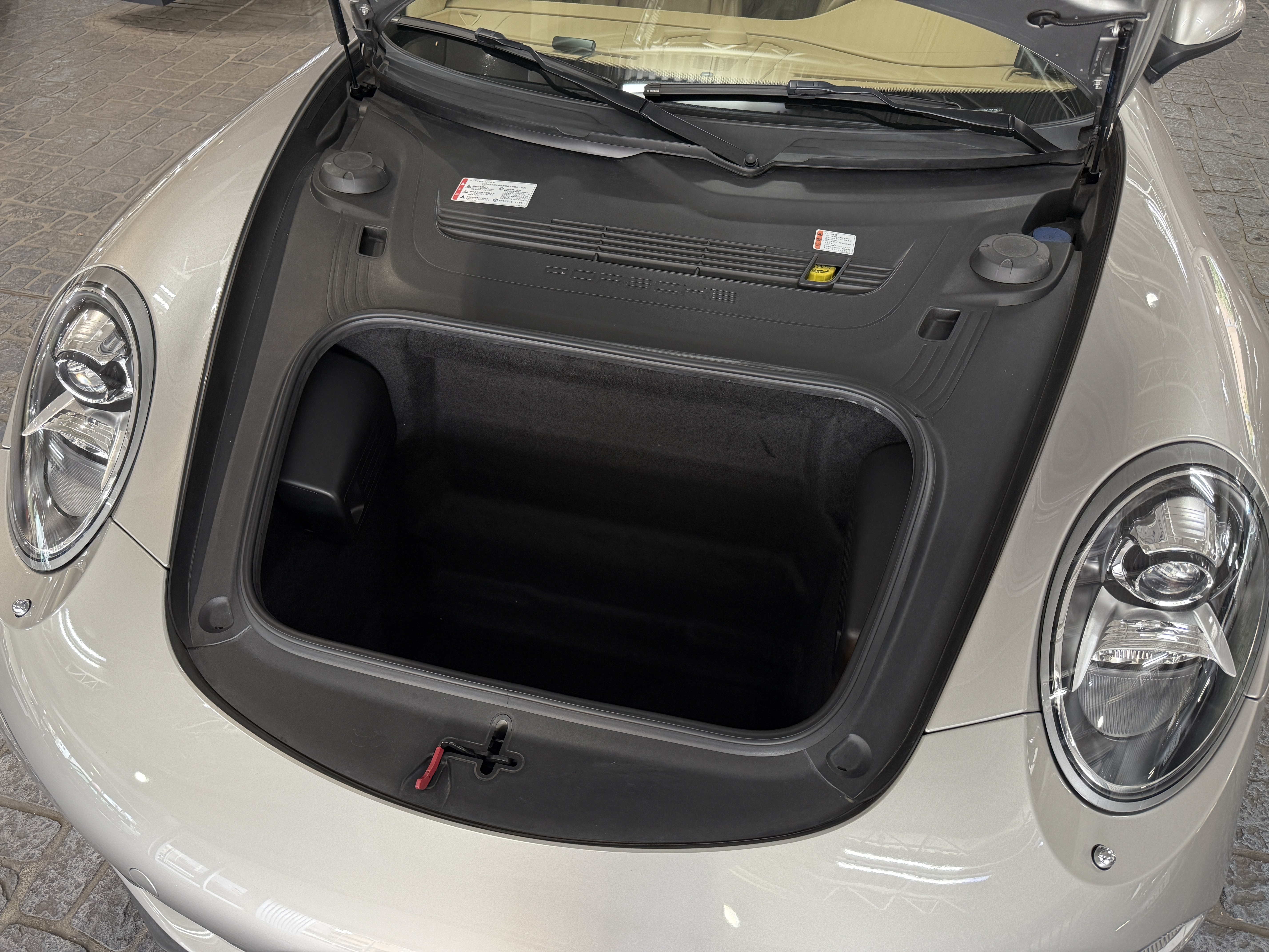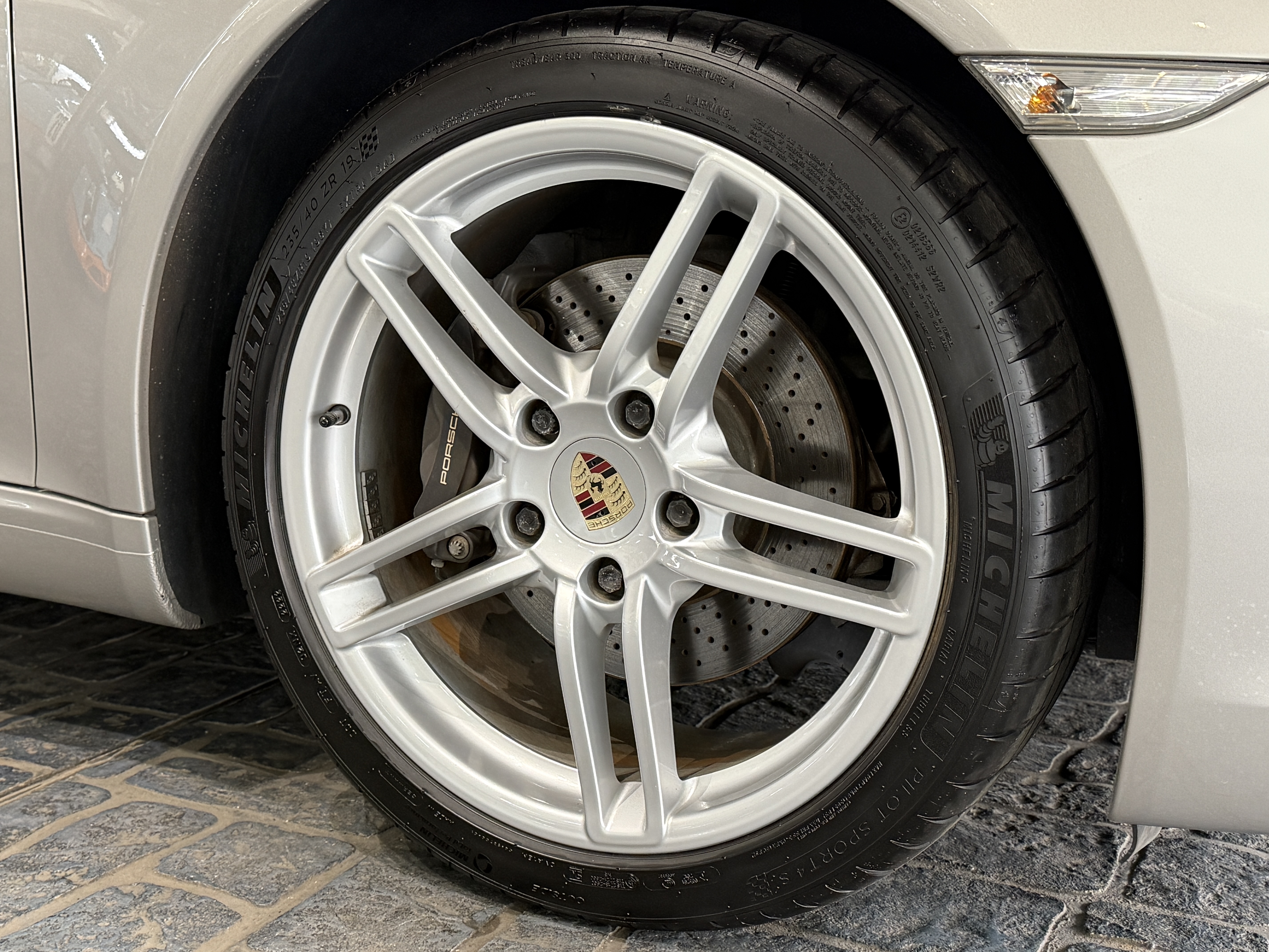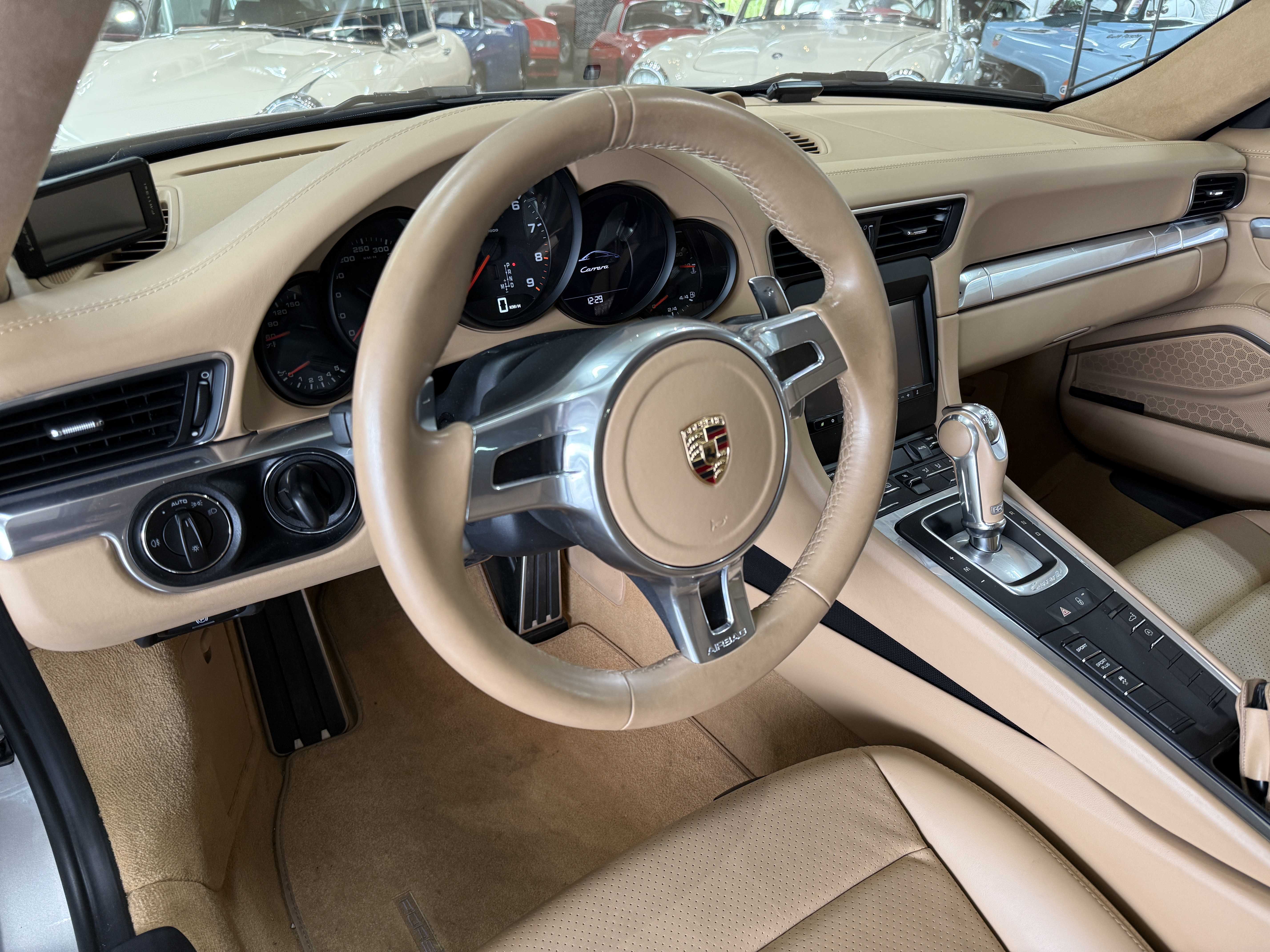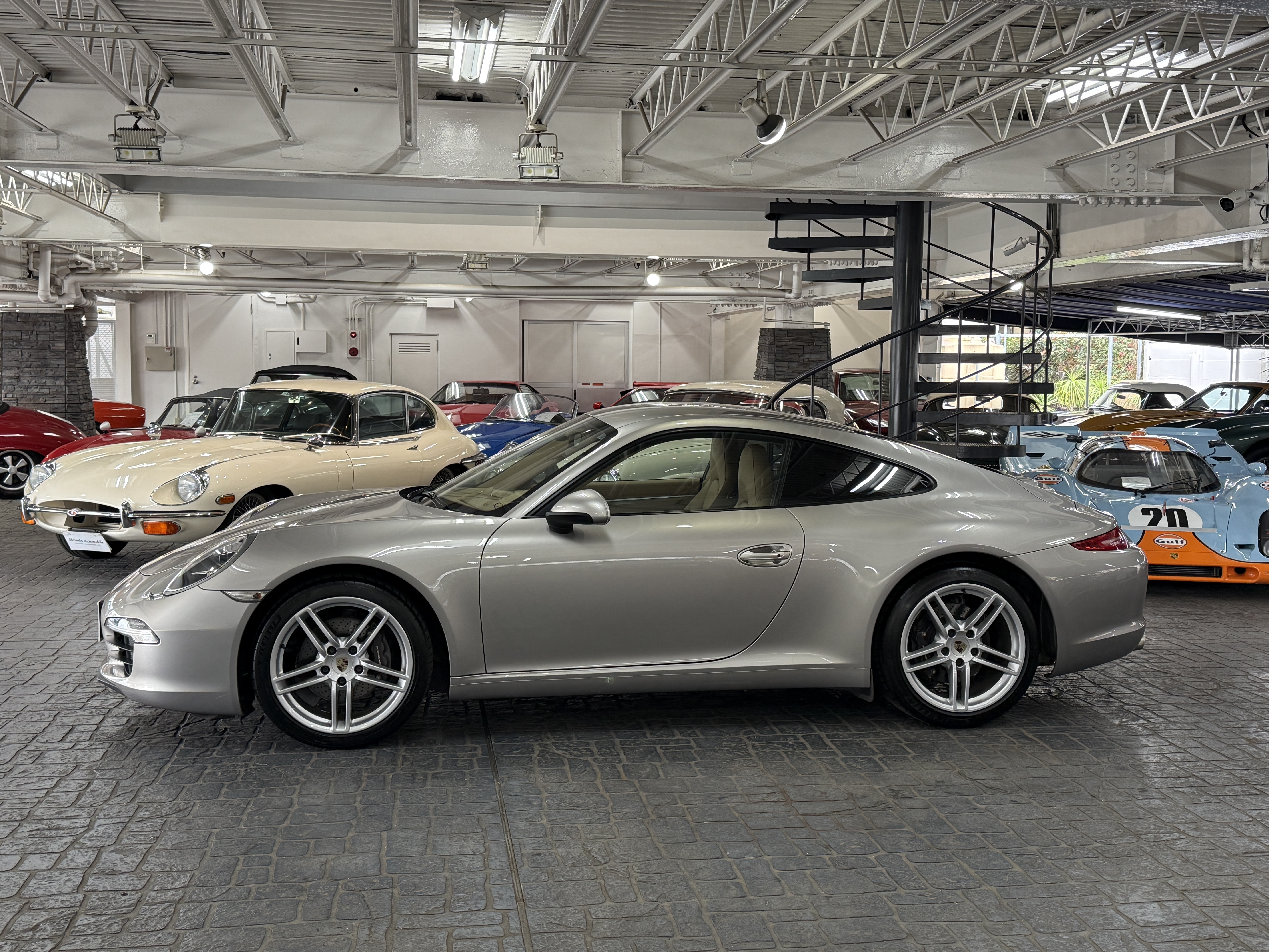 ︎2011年8月29日、ドイツ南部の街、シュツットガルト近郊の本社に隣接するポルシェ博物館で「911カレラ・スニークプレビュー」が開催され「991型カレラ」はそこではじめて公開された。先代となる「997型カレラ」から「998型」と型式を継承しなかったのは、続き番号にすることで開発中の部品が次期「911」のものと漏洩してしまうのを防ぐためと「997型」のエボリューションモデルでは無く、それ以上に大きな変化・進化が込められた事による。先代の「997型カレラ」に比べ一挙に大型化されるという事前情報が広まる中で、車幅はほぼ同寸の1808mm、全長も56mmという僅かな増加に留まり、ボディサイズの大きな変更は行われなかった。大きくなったように見えるとすれば、100mm延ばされたホイールベースと、拡大されたフロントトレッド、それに伴いより幅広い間隔で、外側にレイアウトされた「911」の特徴となる丸型のヘッドライトによるもの。LEDテクノロジーを用いたテールランプは、シャープな薄型形状とされリア回りはランプ上方レベルで、リアエンドを取り巻く水平ラインが強調され、先代との変化がわかりやすい。ルーフラインが数ミリ下げられ、ウィンドウグラフィックがスリークな形状にリファインされることで、伸びやかで「モダンな911」というイメージのボディデザインは、より「911」らしいデザインを追求した結果だといわれている。そのボディデザインは、メルセデスベンツで初代「SLK」を手がけ「スマート」や「サーブ」を経て2004年にポルシェ・デザイン部門に移籍し、「993型カレラ」をデザインしたハーム・ラガーイの後任としてチーフとなったミハエル・マウアーによるもの。マウアーはナロー時代の「911」がもつ美しいシルエットを意識しつながら、リアフェンダーの織りなす曲面や、丸型ヘッドライトカバーにバブル形状の膨らみを持たせるなど、細部にわたりこだわったデザイン表現を用いている。「991型カレラ」の正式なショーデビューは2011年9月のフランクフルトショーとなる。前世紀末にフラット6エンジンが水冷化され「996型カレラ」として登場した「911」は、キープコンセプトともいえる「997型カレラ」に進化した後、この「991型」では久しぶりの「フルモデルチェンジ」に近い、使用部品の95%が刷新された「911」となっている。先代までの頑強な鋼板製のモノコックボディは、様々な種類のスチールに加え、アルミやマグネシウムなどを用いたハイブリッド構造となり、モノコック単体で45kg軽く仕上げられている。フロントフェンダー、トランク・フード、ドア、リア・エンジンリッドはアルミ製とされ、インテリアトリムの樹脂素材の最適化により、さらなる軽量化もほどこされている。「991型」では先代に比べ、静的捩れ剛性で25%、動的捩れ剛性で20%、固有振動数で13%の向上が図られ、軽量化されながらも剛性アップも達成されている。ダイエットされたボディに対しパワーアップしたエンジンを搭載、組み合わされるギアボックスは、新型7段PDKと、これをベースに乗用車史上初となる7段MTが設定されている。新たに採用された電動パワーステアリングは、良好なタッチとナチュラルな感触により洗練されたフィーリングをもちながらも、路面からのキックバックが少なくおさえられ、古くからの「911」ファンには少し物足りなく感じられるかもしれない。120km/hで上昇し、80km/hで格納される電動式リア・スポイラーは、空力的に有効な範囲が898mmから1137mmに拡大され、サイドウィンドウ前端からドアパネルに移設したサイド・ミラーやフラット化されたフロアパネル、冷却システムの刷新により、ワイドタイヤ装着にもかかわらずCd値は0.29へと向上している。「964型」以降全ての「911」開発に携わり「991型」の開発も担当した、チーフ・プロジェクト・エンジニアのアウグスト・アハライトナーは「あらゆる重要な分野で991型は一歩前進している」とコメントを残している。また、2006年以降ポルシェの開発プロジェクト・チームに加わった伝説のラリー・ドライバー、ヴァルター・レアルは「991型は、バランスが良くドライバーに従順で、これ以上手の入れようの無いクルマ」と高い完成度を力説している。︎今回入荷した2012年式「911カレラPDK」に搭載されるエンジンは、MA104型とよばれるオールアルミ製の水冷式・水平対向直噴6気筒DOHC24バルブエンジンとなり、ボア×ストローク97mm×77.5mmで、3436ccの排気量を得る。MA104型エンジンは先代の「997型カレラ」が搭載するMA102型エンジンに比べ178cc少ない排気量となっている。これは、ボアは共通ながらストロークを「997型カレラS」用の3.8ℓ・MA101型のコンロッドを用いる事で4mmショート・ストローク化した事によるもの。排気量を下げながらも12.5の圧縮比をもち、最高出力は350馬力/7400rpm、最大トルク39.8kgm/5600rpmを発揮、「997型カレラ」に比べ、5馬力アップと同等のトルク値を実現している。排気量を縮小しながらもパフォーマンス・アッ