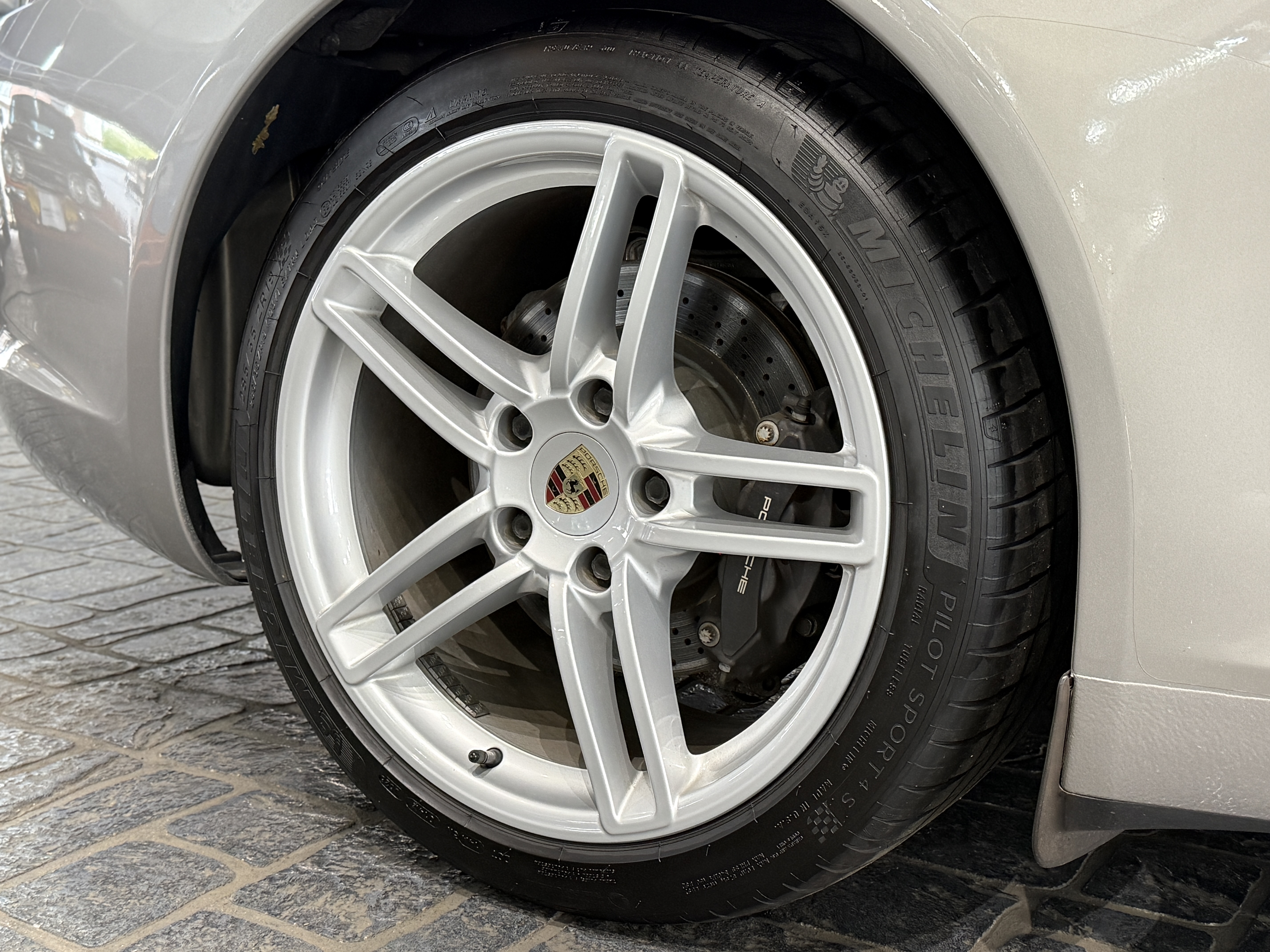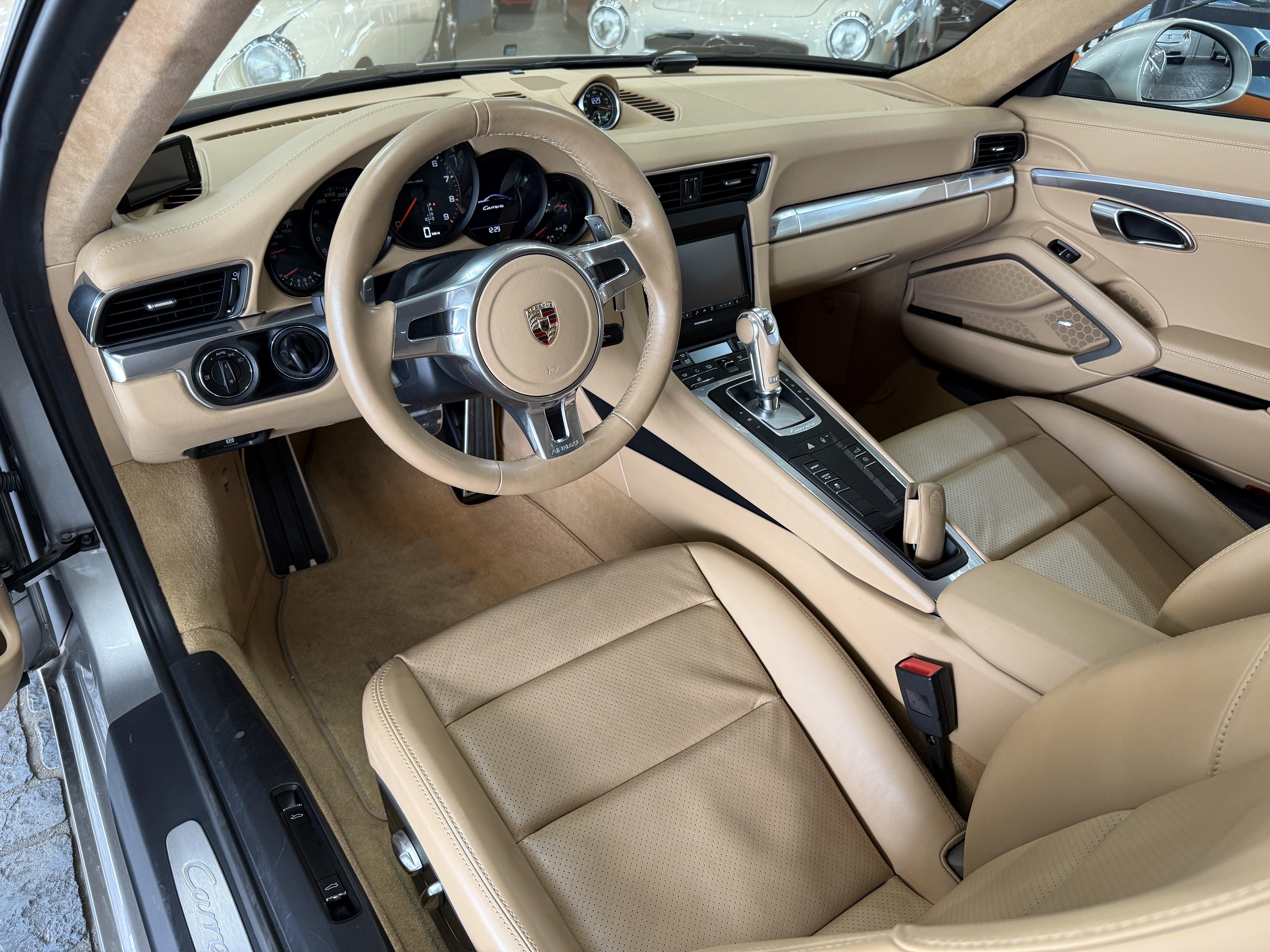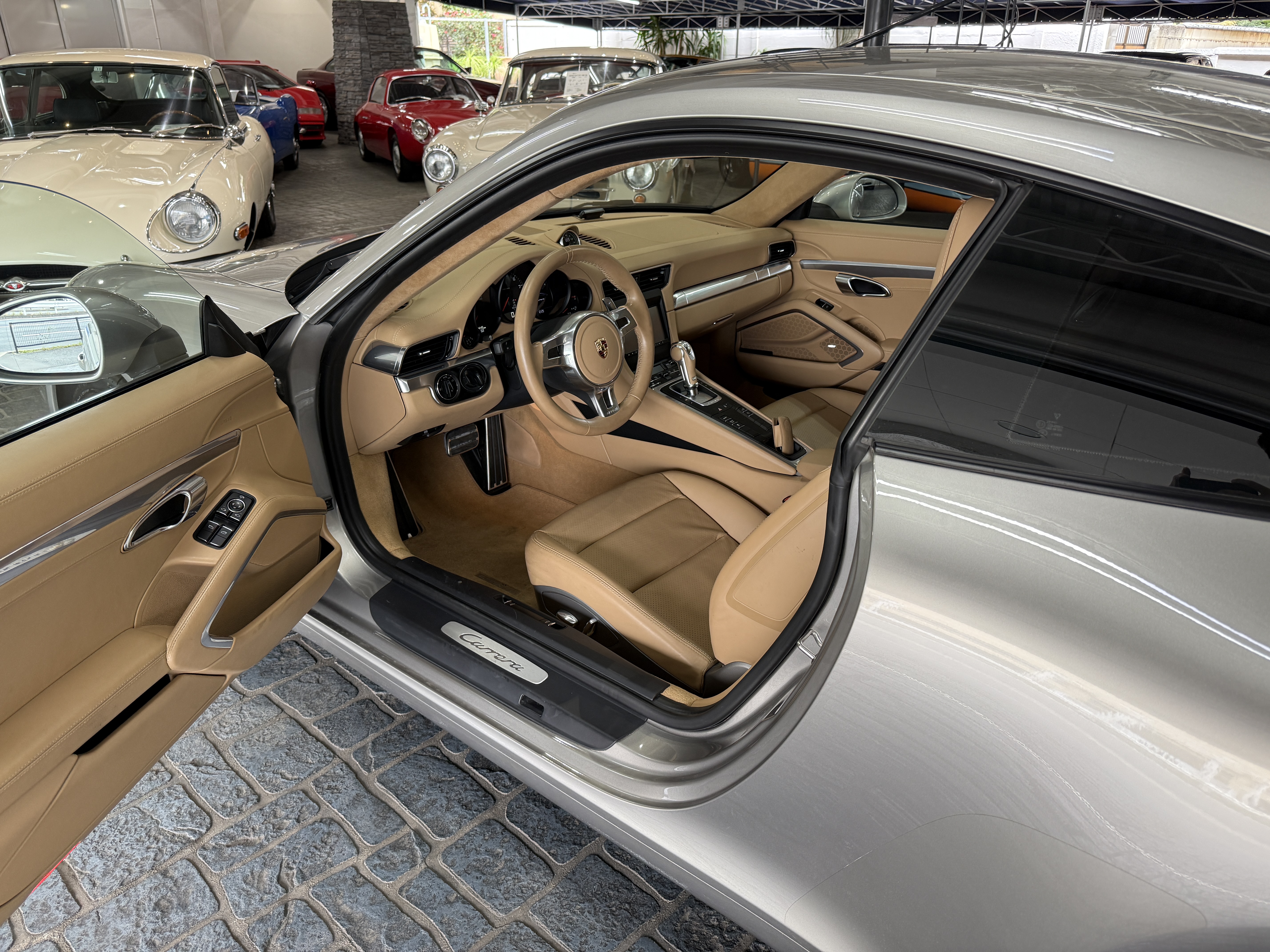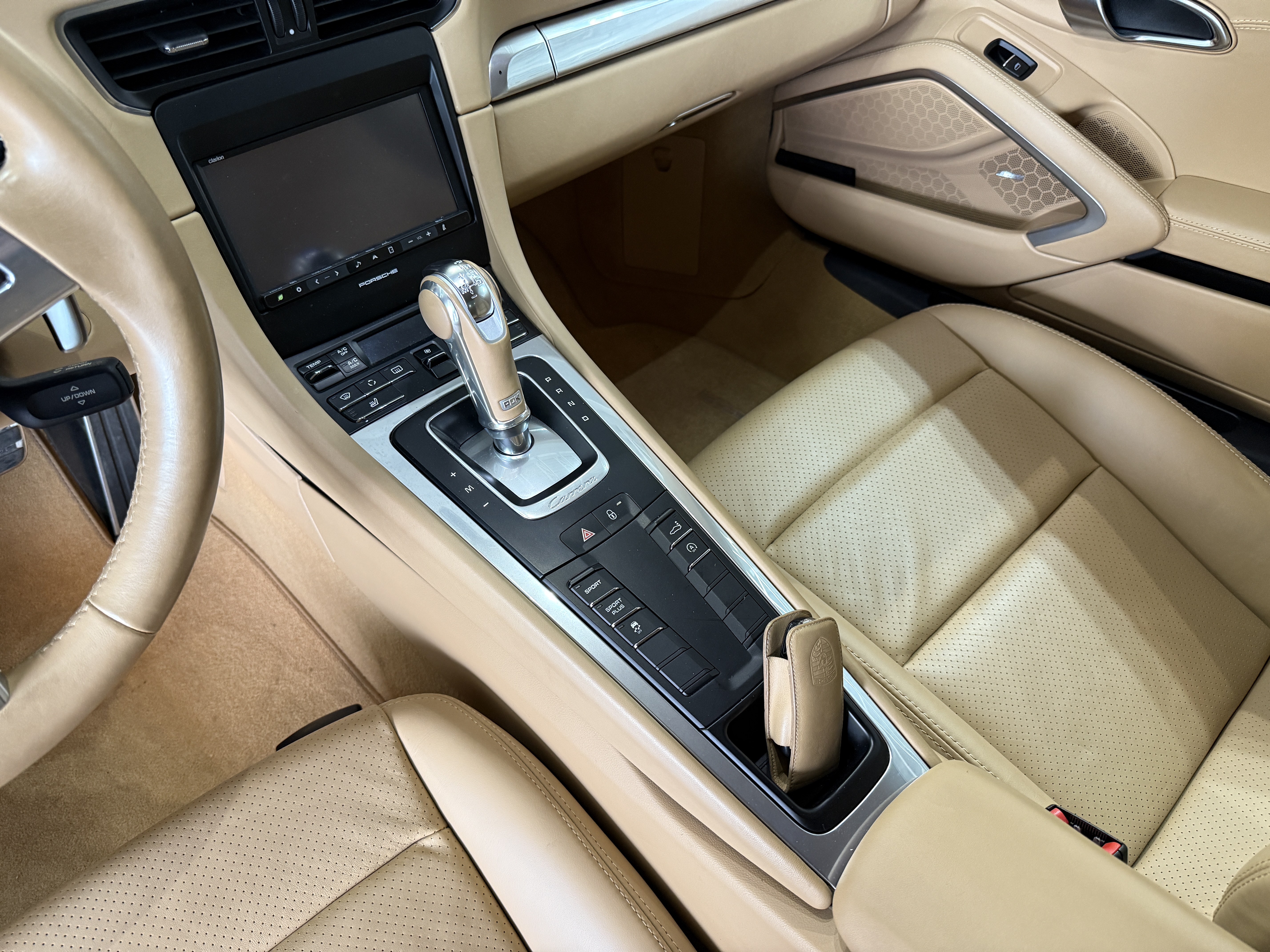 ︎2011年8月29日、ドイツ南部の街、シュツットガルト近郊の本社に隣接するポルシェ博物館で「911カレラ・スニークプレビュー」が開催され「991型カレラ」はそこではじめて公開された。先代となる「997型カレラ」から「998型」と型式を継承しなかったのは、続き番号にすることで開発中の部品が次期「911」のものと漏洩してしまうのを防ぐためと「997型」のエボリューションモデルでは無く、それ以上に大きな変化・進化が込められた事による。先代の「997型カレラ」に比べ一挙に大型化されるという事前情報が広まる中で、車幅はほぼ同寸の1808mm、全長も56mmという僅かな増加に留まり、ボディサイズの大きな変更は行われなかった。大きくなったように見えるとすれば、100mm延ばされたホイールベースと、拡大されたフロントトレッド、それに伴いより幅広い間隔で、外側にレイアウトされた「911」の特徴となる丸型のヘッドライトによるもの。LEDテクノロジーを用いたテールランプは、シャープな薄型形状とされリア回りはランプ上方レベルで、リアエンドを取り巻く水平ラインが強調され、先代との変化がわかりやすい。ルーフラインが数ミリ下げられ、ウィンドウグラフィックがスリークな形状にリファインされることで、伸びやかで「モダンな911」というイメージのボディデザインは、より「911」らしいデザインを追求した結果だといわれている。そのボディデザインは、メルセデスベンツで初代「SLK」を手がけ「スマート」や「サーブ」を経て2004年にポルシェ・デザイン部門に移籍し、「993型カレラ」をデザインしたハーム・ラガーイの後任としてチーフとなったミハエル・マウアーによるもの。マウアーはナロー時代の「911」がもつ美しいシルエットを意識しつながら、リアフェンダーの織りなす曲面や、丸型ヘッドライトカバーにバブル形状の膨らみを持たせるなど、細部にわたりこだわったデザイン表現を用いている。「991型カレラ」の正式なショーデビューは2011年9月のフランクフルトショーとなる。前世紀末にフラット6エンジンが水冷化され「996型カレラ」として登場した「911」は、キープコンセプトともいえる「997型カレラ」に進化した後、この「991型」では久しぶりの「フルモデルチェンジ」に近い、使用部品の95%が刷新された「911」となっている。先代までの頑強な鋼板製のモノコックボディは、様々な種類のスチールに加え、アルミやマグネシウムなどを用いたハイブリッド構造となり、モノコック単体で45kg軽く仕上げられている。フロントフェンダー、トランク・フード、ドア、リア・エンジンリッドはアルミ製とされ、インテリアトリムの樹脂素材の最適化により、さらなる軽量化もほどこされている。「991型」では先代に比べ、静的捩れ剛性で25%、動的捩れ剛性で20%、固有振動数で13%の向上が図られ、軽量化されながらも剛性アップも達成されている。ダイエットされたボディに対しパワーアップしたエンジンを搭載、組み合わされるギアボックスは、新型7段PDKと、これをベースに乗用車史上初となる7段MTが設定されている。新たに採用された電動パワーステアリングは、良好なタッチとナチュラルな感触により洗練されたフィーリングをもちながらも、路面からのキックバックが少なくおさえられ、古くからの「911」ファンには少し物足りなく感じられるかもしれない。120km/hで上昇し、80km/hで格納される電動式リア・スポイラーは、空力的に有効な範囲が898mmから1137mmに拡大され、サイドウィンドウ前端からドアパネルに移設したサイド・ミラーやフラット化されたフロアパネル、冷却システムの刷新により、ワイドタイヤ装着にもかかわらずCd値は0.29へと向上している。「964型」以降全ての「911」開発に携わり「991型」の開発も担当した、チーフ・プロジェクト・エンジニアのアウグスト・アハライトナーは「あらゆる重要な分野で991型は一歩前進している」とコメントを残している。また、2006年以降ポルシェの開発プロジェクト・チームに加わった伝説のラリー・ドライバー、ヴァルター・レアルは「991型は、バランスが良くドライバーに従順で、これ以上手の入れようの無いクルマ」と高い完成度を力説している。︎今回入荷した2012年式「911カレラPDK」に搭載されるエンジンは、MA104型とよばれるオールアルミ製の水冷式・水平対向直噴6気筒DOHC24バルブエンジンとなり、ボア×ストローク97mm×77.5mmで、3436ccの排気量を得る。MA104型エンジンは先代の「997型カレラ」が搭載するMA102型エンジンに比べ178cc少ない排気量となっている。これは、ボアは共通ながらストロークを「997型カレラS」用の3.8ℓ・MA101型のコンロッドを用いる事で4mmショート・ストローク化した事によるもの。排気量を下げながらも12.5の圧縮比をもち、最高出力は350馬力/7400rpm、最大トルク39.8kgm/5600rpmを発揮、「997型カレラ」に比べ、5馬力アップと同等のトルク値を実現している。排気量を縮小しながらもパフォーマンス・アッ