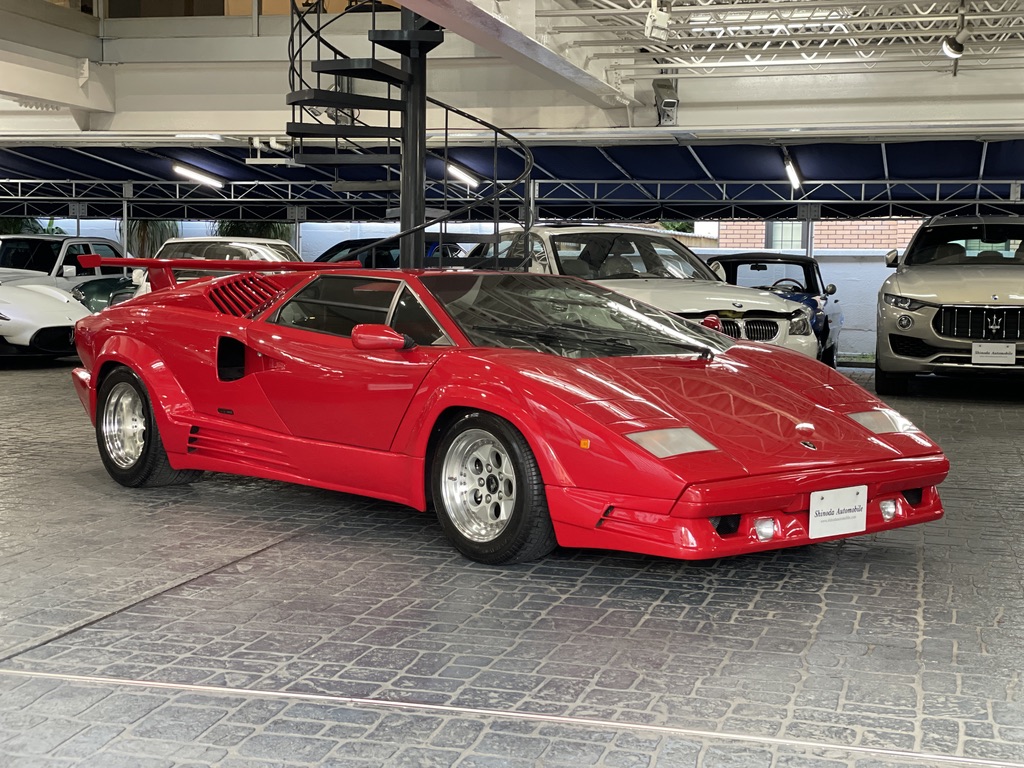 「カウンタック・アニバーサリー」のデビューは1988年9月8日、新たにランボルギーニ社の経営権を手に入れたクライスラー社社長リー・アイアコッカ、並びにランボルギーニ創業者フェルッチオ・ランボルギーニ参列のもと挙行された「ランボルギーニ社創立25周年記念式典」のイタリアはパルマに近い会場であった。ショー・デビューは同じ月のパリ・サロンとなる。パワートレインは、それまで製造されていた「5000クワトロバルボーレ」を踏襲しながら、リニューアルされたエクステリア、及びインテリアを持つ。フロントエアダム、サイドスカート、前後バンパー、アグレッシブなボディショルダー部のエアスクープなどが専用デザインをもつ「カウンタック」の最終進化モデルとなる。「カウンタック」のデザインはカロッツェリア・ベルトーネに在籍したマルチェロ・ガンディーニによるものとなるが「カウンタック・アニバーサリー」の専用エクステリアのデザインは、オラチオ・パガーニによるもの。1955年アルゼンチンに生まれたパガーニは、カーデザイナーを目指し大学でデザインとエンジニアリングを学んだ。その後、5回のF1チャンピオンの経歴をもつ、同郷のファン・マヌエル・ファンジオをたより1982年ランボルギーニ社に入る。「LM002」「カウンタック・アニバーサリー」開発に携り、複合素材の知識に明るくカーボンファイバー素材の市販車への導入を図り、チューブラーフレームでは無くカーボンフレームをもつ「カウンタック・エボルツィオーネ」を製作するまでになった。その技術は「カウンタック・アニバーサリー」にも活かされ、ボディシェルの一部に複合素材が使用される初の市販車とされた。1992年オラチオ・パガーニは独立し1999年には「パガーニ・ゾンタ」を発表する。「カウンタック」登場時の「LP400」の設計はパオロ・スタンツァーニによるもので、1968年「ミウラ」のグレードが「S」から「SV」に進化するタイミングで始まっていた。シャーシ開発のジャンパオロ・ダラーラの「試作車を販売してしまった」という発言どおり「ミウラ」での熟成度と信頼性を確立出来なかったという反省から「カウンタック」の開発に時間をかけたかったのだろう。プロトタイプとなる「LP500」は鋼板モノコック構造となっていたが、強度と重さの関係から、市販車となる「LP400」では作り慣れたチューブラーフレーム構造に変更された。そのフレームはマルケジーニ社に、外皮となるアルミパネルはトリノのITCA社に発注された。出来上がったチューブラーフレームは、直径40mmの円断面鋼管によるトラス構造を基本に、ため息が出る程複雑精緻に組み上げたもので、工芸品ともよべる贅沢でオーバークオリティなものとなっている。それにも増して鮮やかなのは、パワートレインレイアウト。「ミウラ」のV12エンジン横置きレイアウトは、リアヘビーとスペースの関係からサスペンションアーム設計の自由度に欠けた事により「カウンタック」では縦置きとされた。しかも、通常の縦置きとは前後逆に配置し、ボディ前方に向かってクラッチ、トランスミッションと並べてある。前方にアウトプットされた出力は、エンジン直下のウェットサンプのオイルパンの中をドライブシャフトが貫通し、リアデフに伝達されるという斬新なレイアウトとなる。スタンツァーニはこの設計でV12エンジン縦置きと、短いホイールベース内にパワートレインを納めるという事を両立してみせた。「カウンタック・アニバーサリー」にもこのチューブラーフレームとパワートレインレイアウトが継承されている。エンジンは「フェラーリ250GTO」の開発で名を馳せたジオット・ビッザリーニ設計によるものを基本としたもの。V12エンジンとしては極めてコンパクトな外寸をもち、ひたすらパワー志向で仕立てられ、原初設計3.5ℓで「ミウラ」搭載時に、ビッザリーニの後を引き継いだジャンパオロ・ダラーラにより4ℓ化され「カウンタックLP400」にも搭載された。4ℓ化された時点で基本設計からの伸びしろを使い果たしたこのエンジンを、マセラティからランボルギーニの技術チーフに就任したジュリオ・アルフィエーリが救う事になる。ジュリオ・アルフィエーリは1961年にフェラーリからジャンパオロ・ダラーラを引き抜きマセラティで育てた人物。ダラーラは、その後ランボルギーニに移籍し「ミウラ」で脚光を浴びるが、アルフィエーリはその裏で「マセラティ・ボーラ」を地道に開発していた。そのアルフィエーリが、ランボルギーニの伸び代を使い果たしたエンジンのブロックとシリンダーヘッドの間にアルミスペーサーを挿入し、ストローク延長の余裕を与えた。これにより「カウンタック・アニバーサリー」に搭載される5.2ℓまで拡大されるのに留まらず、次期モデル「ディアブロ」にも5.7ℓ化されて搭載されることとなった。「カウンタック・アニバーサリー」に搭載されるエンジンは60°V12気筒DOHC48バルブとなり