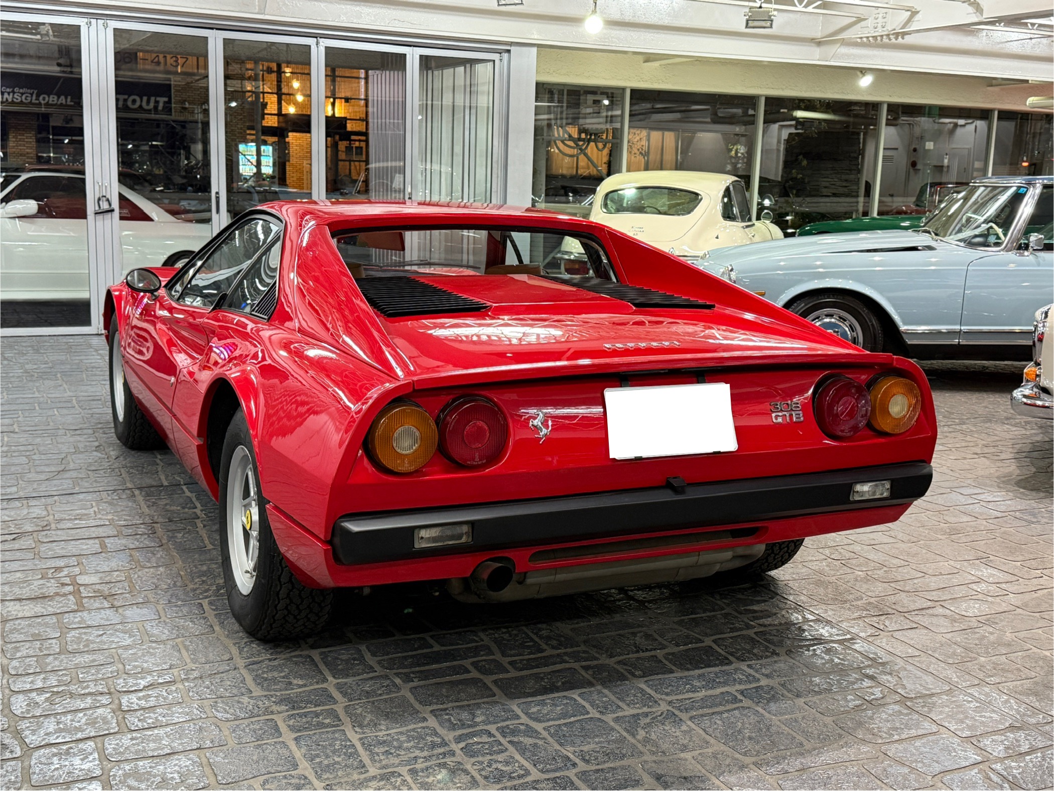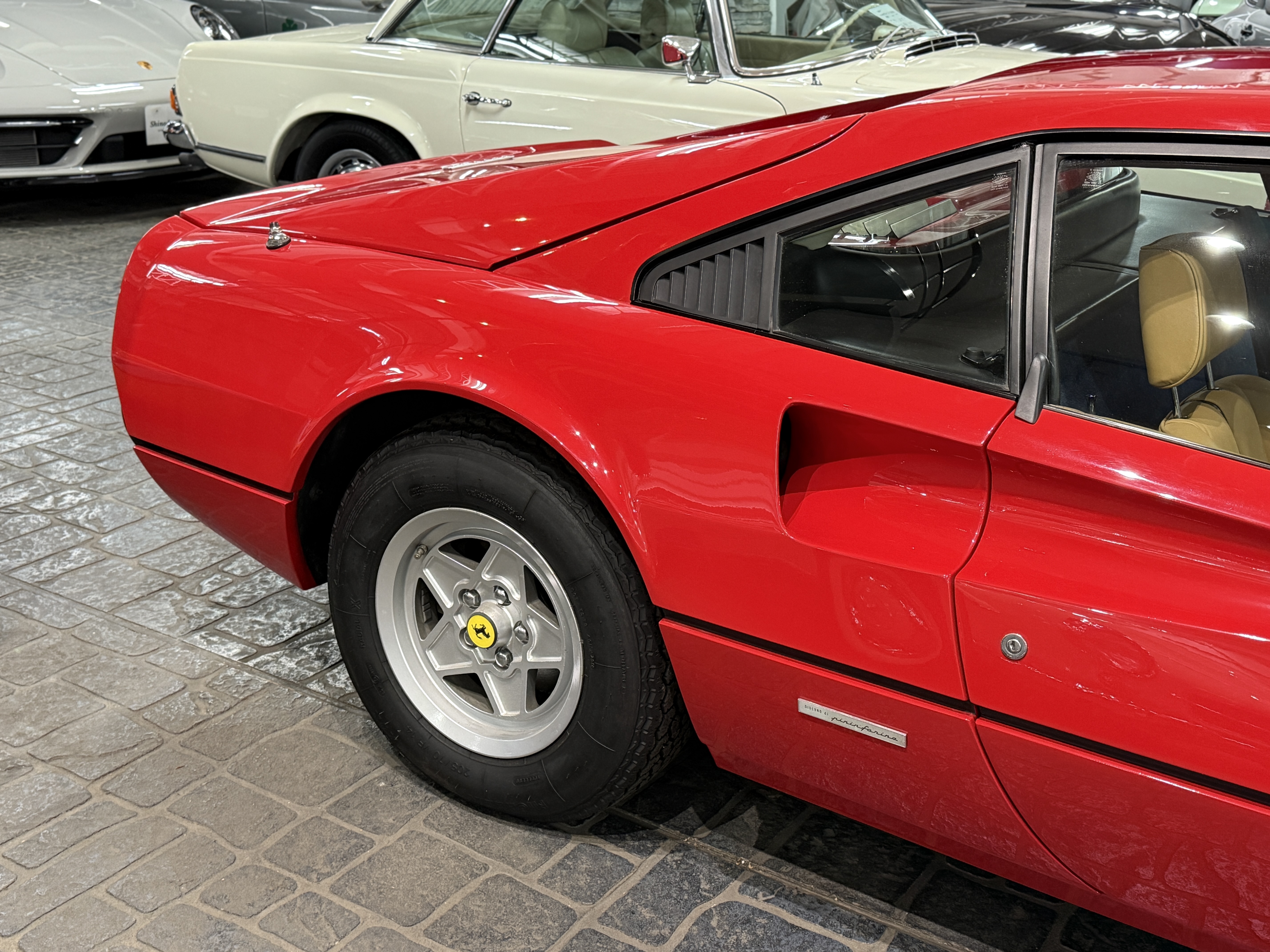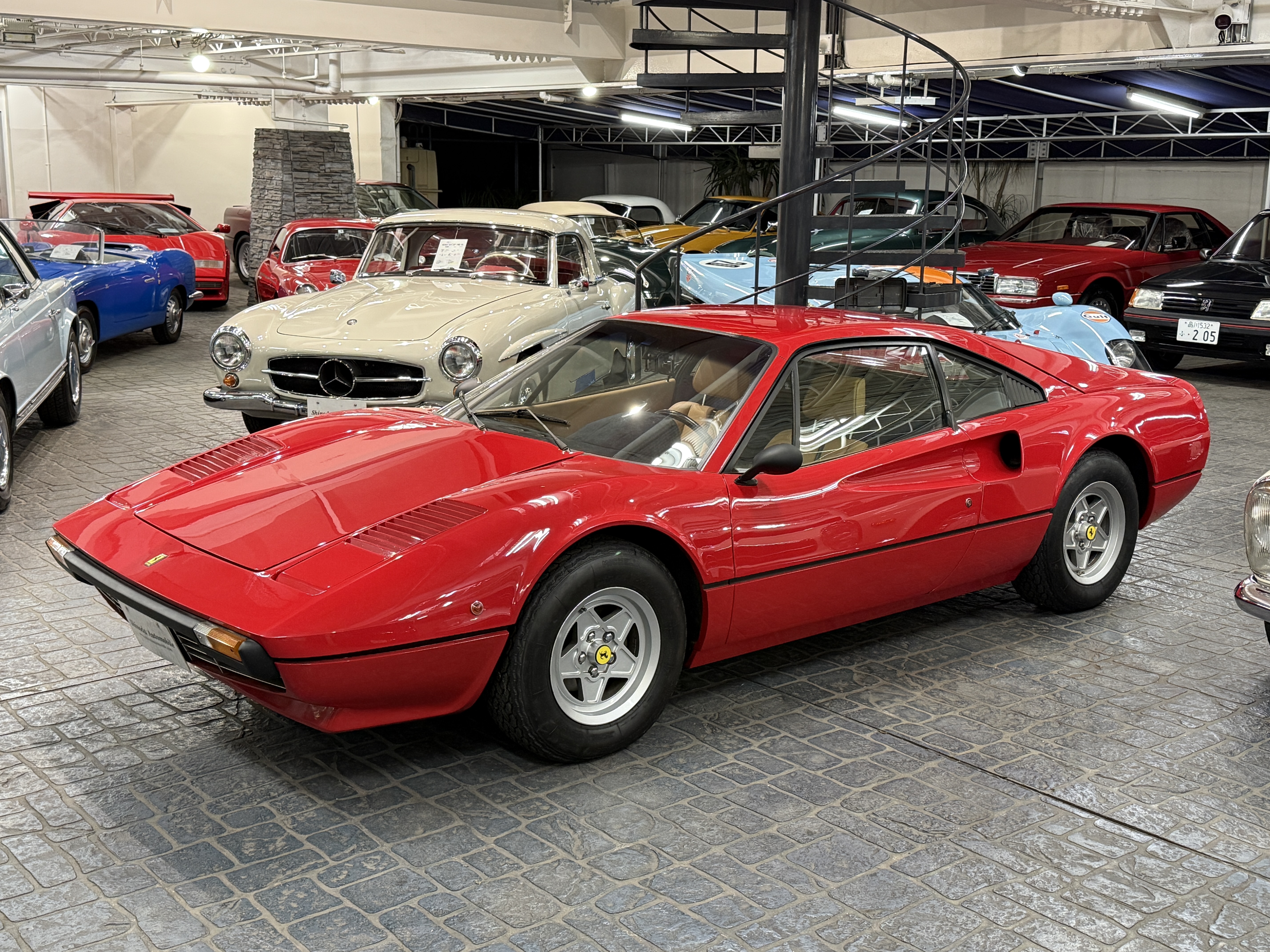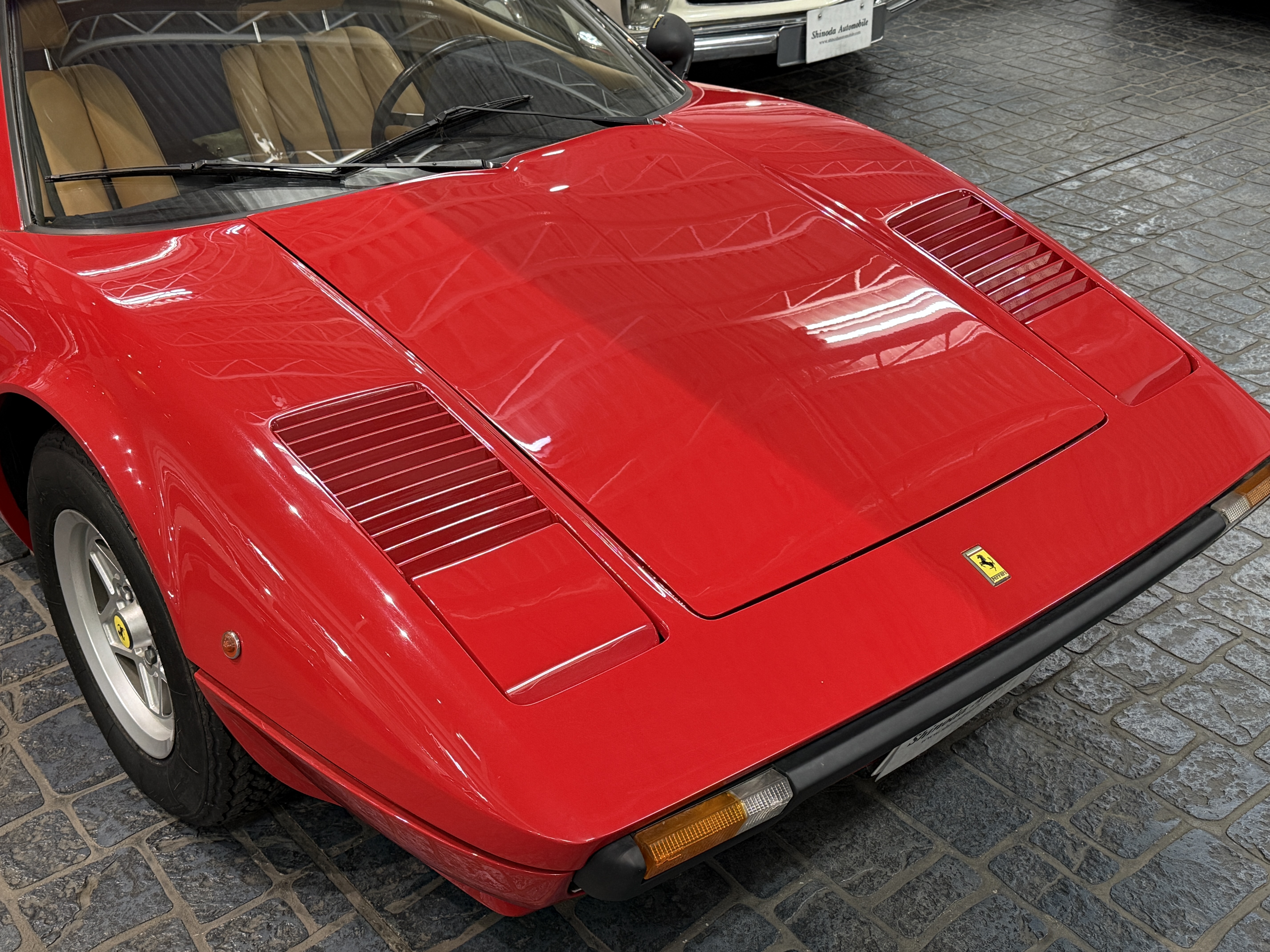 12気筒エンジンを搭載していないにもかかわらず、フェラーリのエンブレムをそのノーズに戴いたロードモデルがショーデビューを果たしたのは、1975年10月2日のパリサロンだった。その淡いブルーメタリックのボディカラーを纏ったスタイルには、あきらかに「ディーノ246GT」の正当な後継車としてのモチーフが使われていた。ドアからリアフェンダーにかけてのエアインテーク、クォーターピラーの造形、70年代的なシャープなエッジが取り込みながらも、本来なら「ディーノ」と呼ばれる1台になっていたのかもしれない。その車の名前は「フェラーリ308GTB」。3ℓでV型8気筒エンジンを搭載するGTで、クーペ(B=ベルリネッタ)という意味を持つ。12気筒エンジン搭載モデルが単一気筒容積を車名に用いるのとは異なり、排気量と気筒数を組み合わせるのも「ディーノ246GT」と同様となる。1992年に刊行された「インサイド・フェラーリ」というマラネロ・ファクトリー内部の写真が多く掲載された本の中に「フードにディーノのバッジの凹み(フェラーリ・エンブレムの縦長では無く、横長タイプ)をもつ」とキャプションに書かれた「308GTB」のプロトタイプと思われる一台の残骸の写真が掲載されている。確かに「ディーノ」の後継車として検討されていた時期があったのだろう。販売拡大を続ける「ポルシェ911」や「ランボルギーニ・ウラッコ」「マセラティ・メラク」に対抗するべく、1973年10月4日のパリサロンで先行デビューを果たした2+2モデルの「ディーノ308GT4」と2車種で「ディーノ・シリーズ」を編成するという考えを、1969年6月以降フェラーリ・ロードモデルを掌握していたフィアットは考えていたのかもしれない。フィアットは「ディーノ」をアルミボディの「206GT」から、製作しやすいスチール・ボディの「246GT」に変更した時の様に、生産規模と販売台数の拡大を目論んでいた。しかしその思惑は外れ、先行デビューした「ディーノ308GT4」への北米での反応が良く無かった。これには誰の目にもエモーショナルなスポーツモデルに映る「ディーノ246GT」とは異なり、プレーンなベルトーネ・デザインの「GT4」のボディデザインはわかりやすさに欠けるだけでなく、北米の顧客は「フェラーリ」のブランドを求めていた。それに加えて1974年9月に北米で施行されたFMVSS(連邦自動車安全基準)により、それまで販売されていた「365GTB/4デイトナ」「365GTC」「ディーノ246GT」が違法車扱いとなり販売出来ない事態を招いていた。この状況を打開すべく登場したのが「フェラーリ308GTB」となる。ボディデザインはピニンファリーナ製となり「デイトナ」「BB」を始めとする11台もの高い人気を誇るフェラーリ・ロードモデルのデザイン担当したレオナルド・フィオラバンティによるものとなる。そのデザインのベースとなったのは、自身がデザインを担当し1968年のトリノショーで発表したプロトタイプ「フェラーリP6」だといわれている。フロントフェンダーからのウェストラインや、サイドのエアインテーク形状、トンネルバックとなるリアのスタイルに共通性が感じられる。70年代的なウェッジを取り込みながらも、丸みと抑揚が感じられるフェンダーラインなどに着目すると、同じ1975年にデビューを飾るフィオラバンティのデザインによる「ランチア・モンテカルロ」に比べ、時代を遡る感じを受ける。1971年にプロトタイプがデビューした「365BB」のバンパーがボディと一体化してデザインされているのに着目すると、独立して別体でデザインされているバンパーが採用されている「308GTB」は、それ以前にデザインされていたのかもしれないとも考えられる。「308GTB」の開発は、フェラーリの市販車開発チームが担い、チーム責任者は以前からその職にあるアンジェロ・ベッレイとなる。地元モデナのフェルモ・コルニ高専卒ながら、創立直後からフェラーリに入社し勤務を続け、忠実な古参としてエンツォ・フェラーリから篤い信頼を得る人物で「275GTB」に始まり「テスタロッサ」までフェラーリ・ロードモデル開発に従事した。「308GTB」の車体構造は「ディーノ246GT」を踏襲した、フェラーリ伝統となるチューブラーフレーム構造となるが、FMVSSに対応したエネルギー吸収バンパーが装備可能となっている。フェラーリ御用達の鋼管フレーム専門工房ヴァッカーリによる鋼管フレームは、3本のクロームモリブデン鋼で出来た太い楕円断面鋼管を中心に、角断面鋼管を組み合わせラダー形状のセンターフレームを構築している。そこに前後サスペンションや、パワートレインの支持フレームが締結されている。この古くから用いられるチューブラーフレーム構造のシャーシに対して、その外皮となるボディパネルは、70年代に向けてフェラーリが新たに取り組む軽量化技術が用いられている。同様に運動性能を確保するという考えから、FRP製パーツやアルミ製カウルを導入し先にデビューを飾った「365BB」であったが「ディーノ」後継車とな